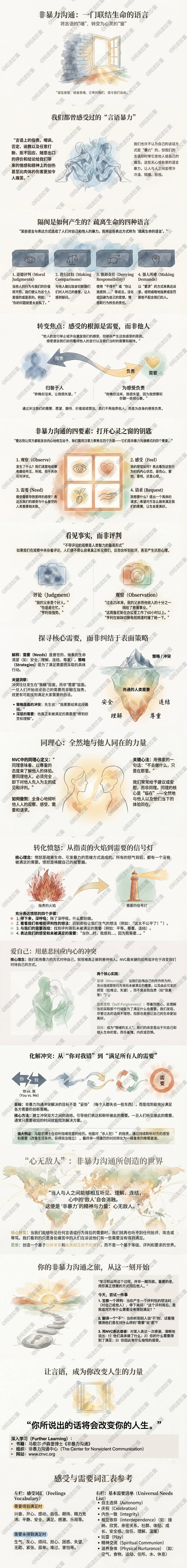 • 自我关怀: NVC 最关键的应用在于改变我们对待自己的方式。通过“哀悼”和“自我宽恕”,我们不再以道德评判来谴责自己,而是带着同理心拥抱自己的不完美,并从中学习成长。