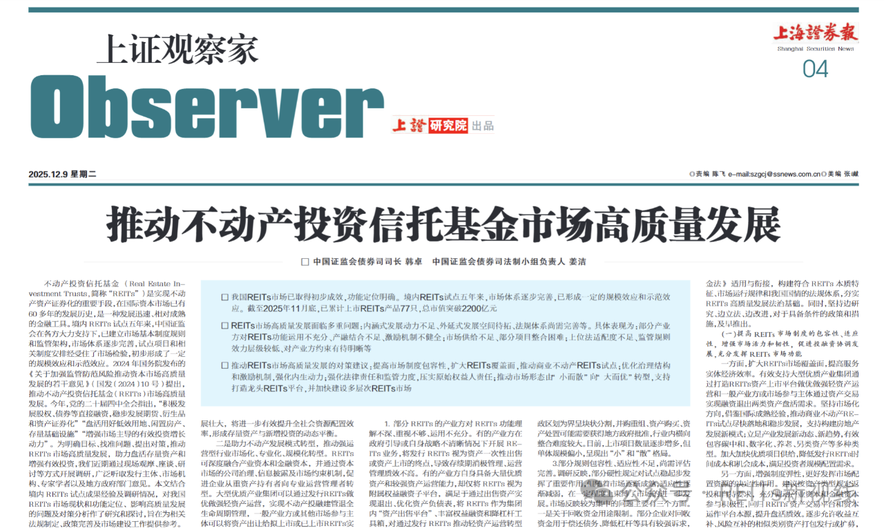 12月9日,《上海证券报》发表了中国证监会债券司司长韩卓、中国证监会债券司法制小组负责人姜洁的署名文章,题目是《推动不动产投资信托基金市场高质量发展》,全文6000余字,其中谈到了我国REITs市场面临的问题以及相关的政策建议,值得关注。