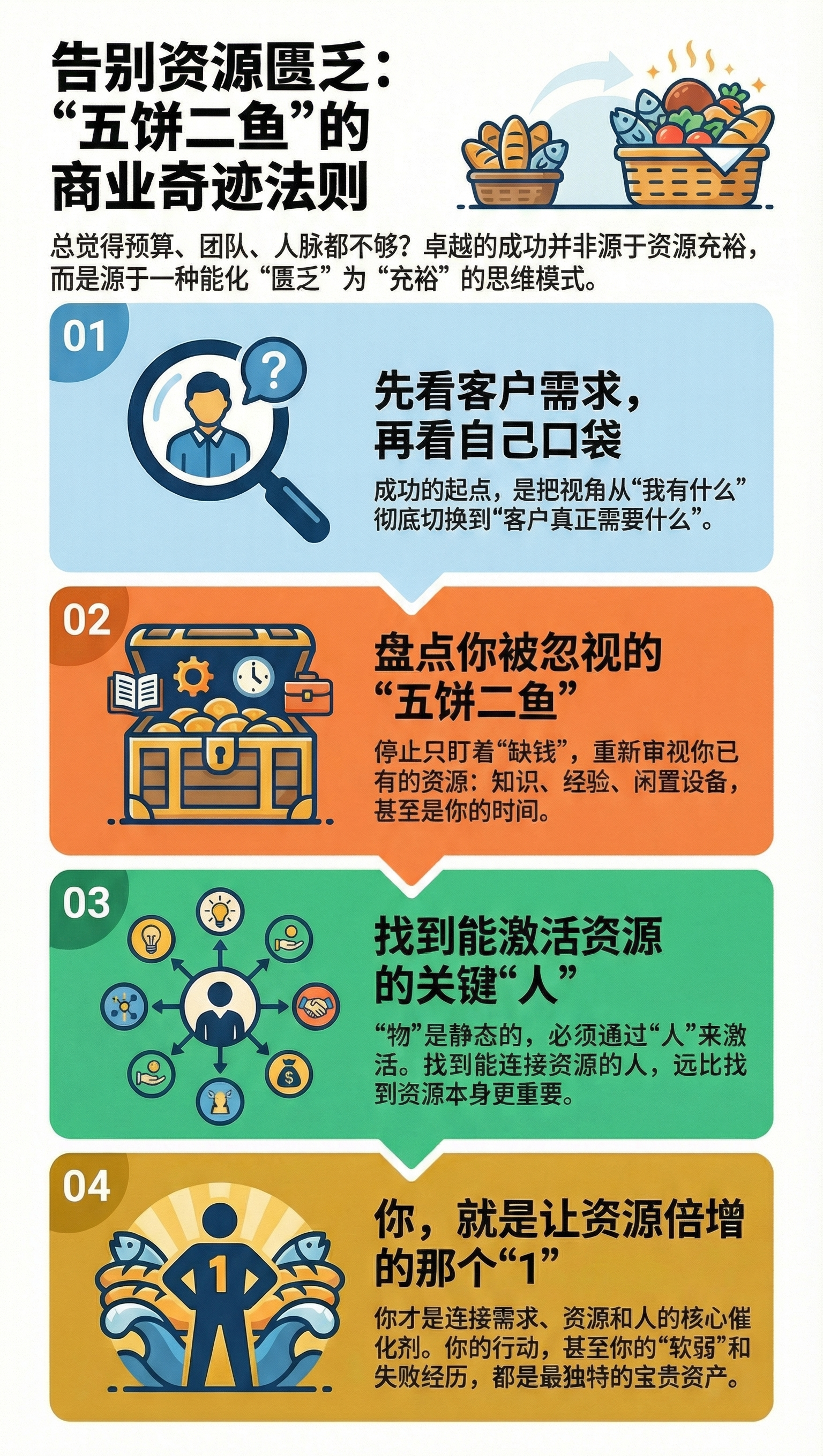 “五饼二鱼”的故事,虽然是一个古老的神迹,却为我们提供了一个应对资源匮乏、满足巨大需求的深刻隐喻和战略框架。在这个故事中,我们看到了一个巨大的“需求”(五千人饥饿),一个看似微不足道的“资源”(五个饼、两条鱼),以及一个“奇迹般”的结果(所有人吃饱还有余)。这并非一个遥不可及的神话,它本质上是一套“以少胜多”的资源整合与价值倍增的思维模式。这个模式告诉我们,在“缺乏”中获得成功,恰恰是最高明的策略。本期节目的目的,就是将这个古老的智慧框架,演绎为一套现代商业中人人可学的实战方法论。我们将通过四个步骤,解构“善用资源”的完整逻辑,帮助你从“资源匮乏”的受害者心态,转变为“资源充裕”的创造者思维。