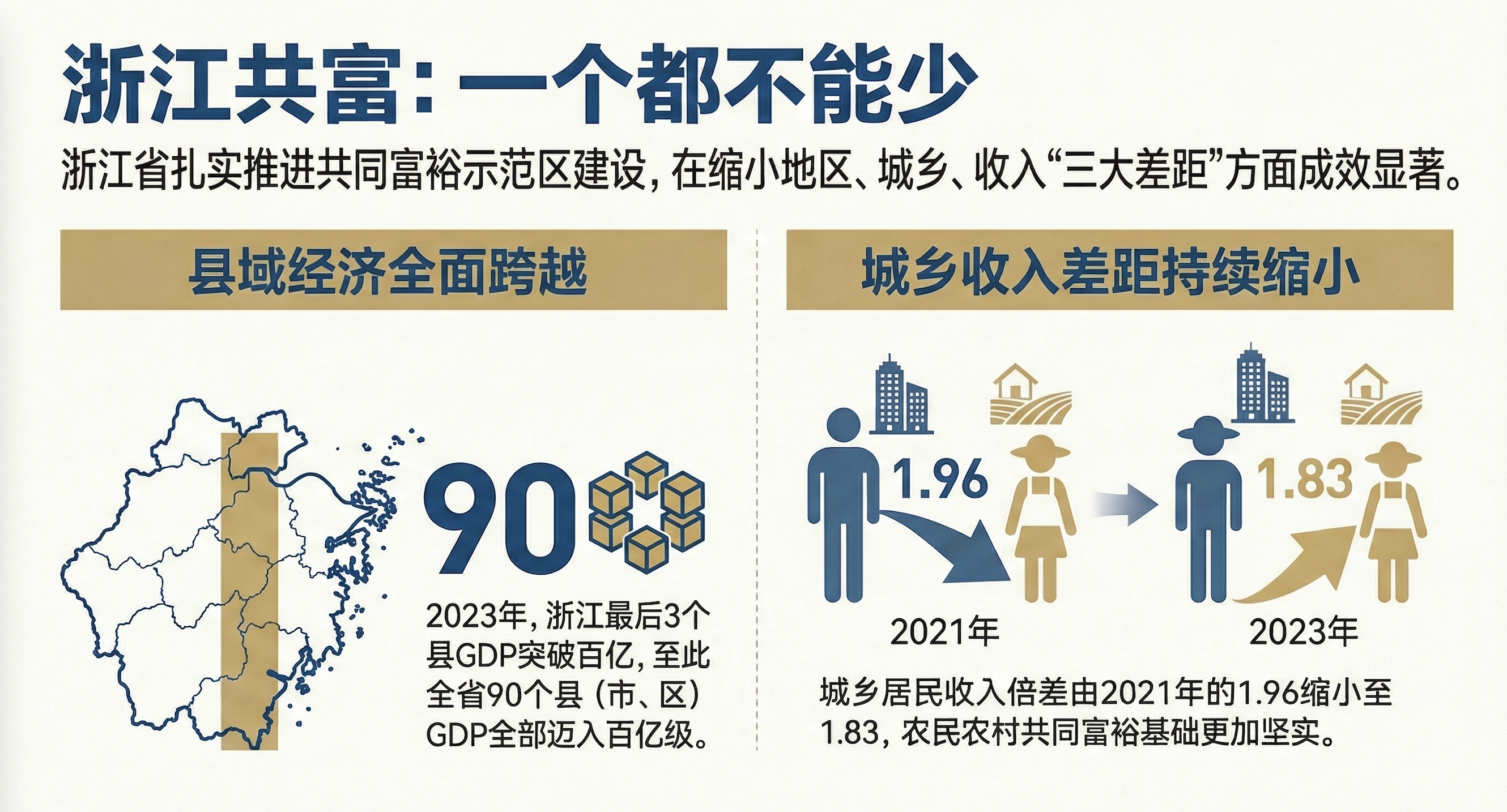 本期内容详述了浙江省在“十四五”期间,围绕建设共同富裕示范区所取得的重大成就和实践方向。核心任务是持续缩小城乡差距、地区差距、收入差距,并通过重大基础设施建设(如杭温高铁、景文高速)和区域政策体系的完善,显著增强了区域协调发展的物理基础。特别值得注意的是,浙江通过“千万工程”牵引,统筹做好“强城、兴村、融合”三篇文章,成功实现了山区海岛县GDP全部破百亿的跨越式发展,并致力于促进更多低收入人群迈入中等收入行列。这些举措体现了浙江在推进共同富裕中“先行示范”的光荣使命和坚定步伐。
