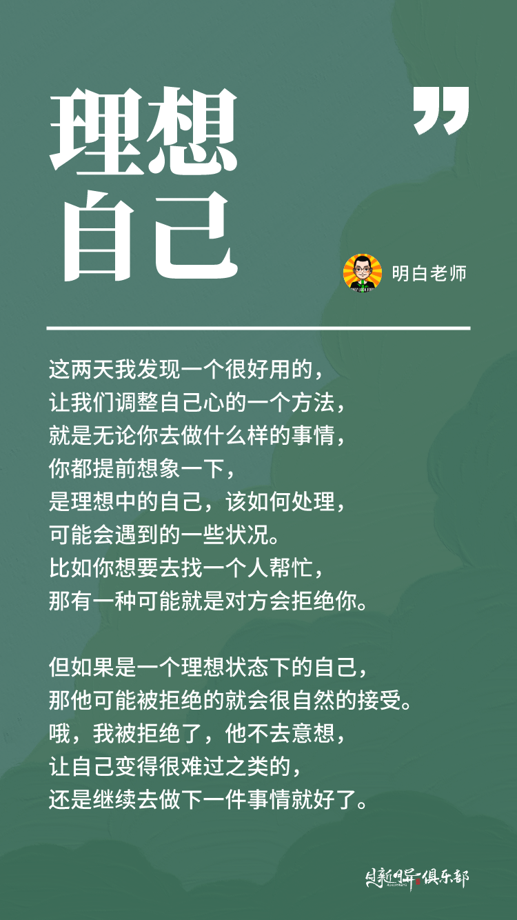 如果是日常正常情况下,我们被拒绝了,一定会感到很伤心、低落呃,难过觉得哎,为什么他拒绝我,是不是我哪里做的不对?但如果是一个理想状态下的自己,那他可能被拒绝的就会很自然的接受。