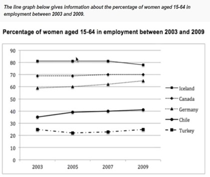 The line graph contrasts the proportion of women aged between 15 and 64 employed in five countries, namely Iceland, Canada, Germany, Chile and Turkey, between 2003 and 2009.