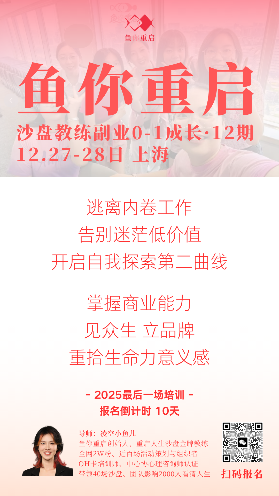 base上海的鱼你重启的创始人小鱼儿,已经影响2000多人体验【重启人生】探索之旅。想报名游戏、成为主持的友友,欢迎扫描小鱼儿二维码,备注不想上班,12月内报名游戏立享9折,报名教练立减500元哦,前30名玩家听友免费报名!