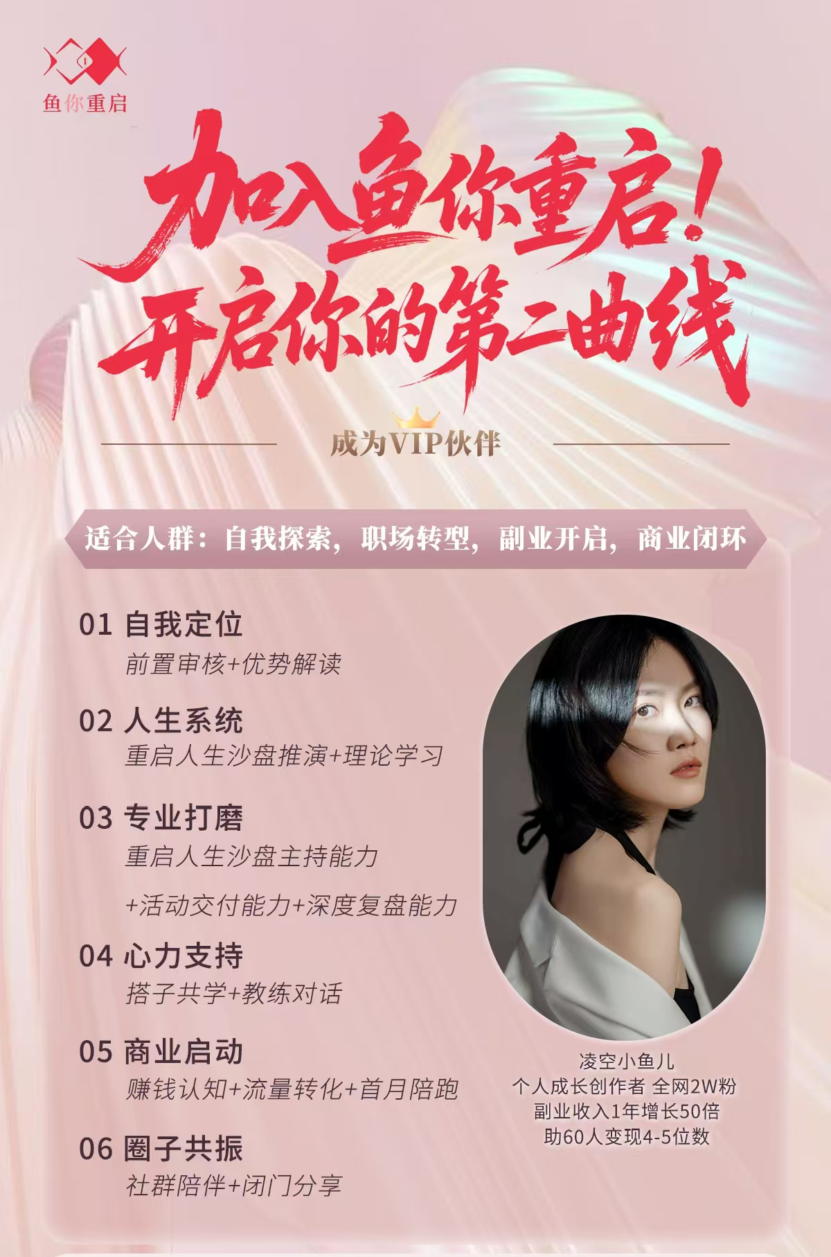 个人成长创作者,全网2W粉副业收入1年增长50倍,助70人变现4-5位数,自我探索狂魔,内容创作8年,笔耕不辍100万字。【凌播微步】主播,办过近百场活动,重启人生沙盘金牌教练,鱼你重启创始人