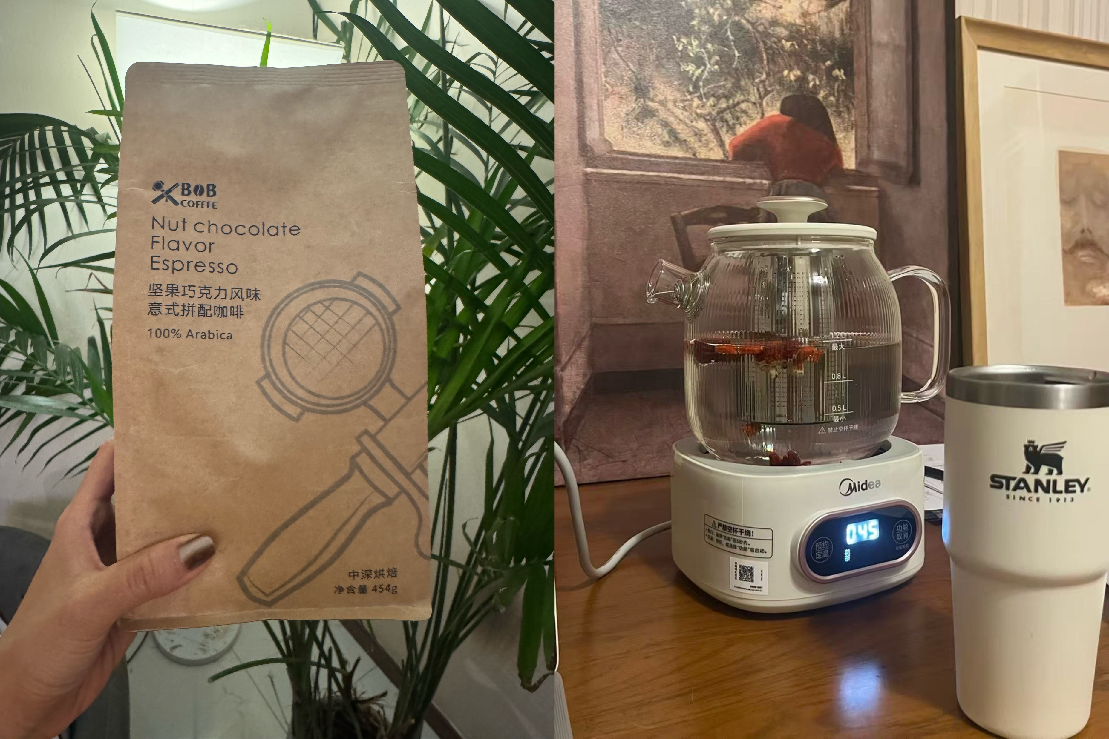 yewei:冬天就想喝手握陶杯喝点热巧,那就把豆子换成坚果巧克力味儿的,中深烘口感醇厚,BOB意式拼配454g一大包,刚好一个月的口粮豆不到70元,性价比之选👍