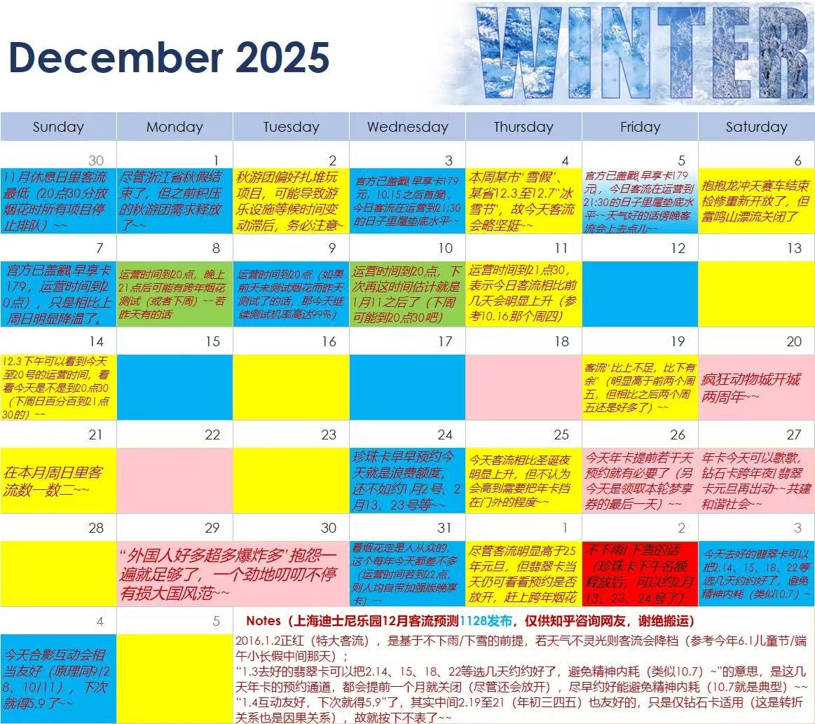 小红书大神“lucy”预测的2025年12月上海迪士尼乐园客流日历