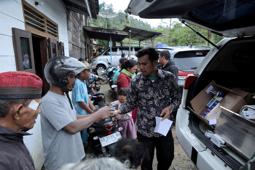 ( 11月27日,在印度尼西亚苏门答腊岛北苏门答腊省,工作人员为村民分发药物。 )