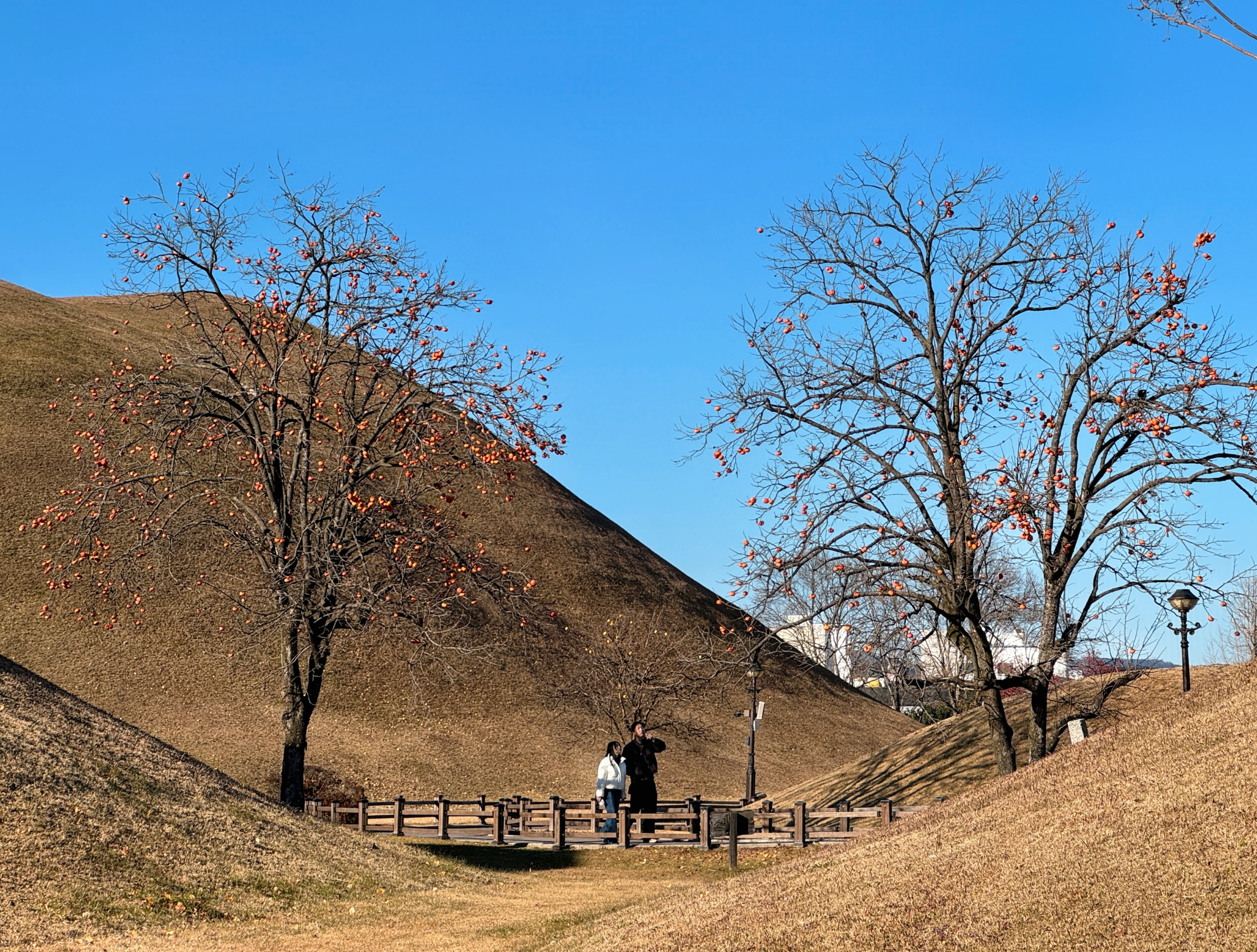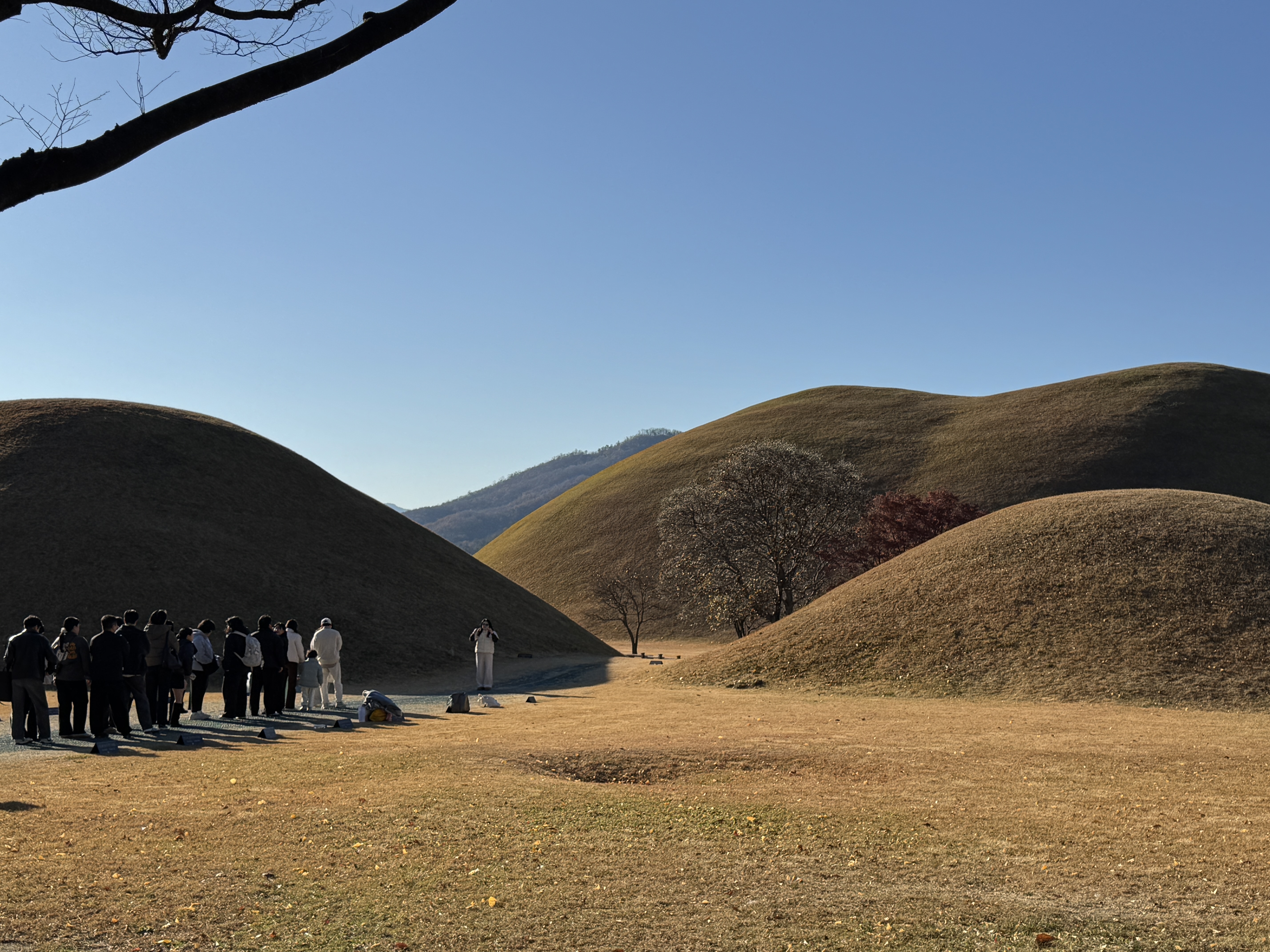 ▼庆州的市中心就是一座坟包连着一座坟包,游客排队在皇南大冢前拍照