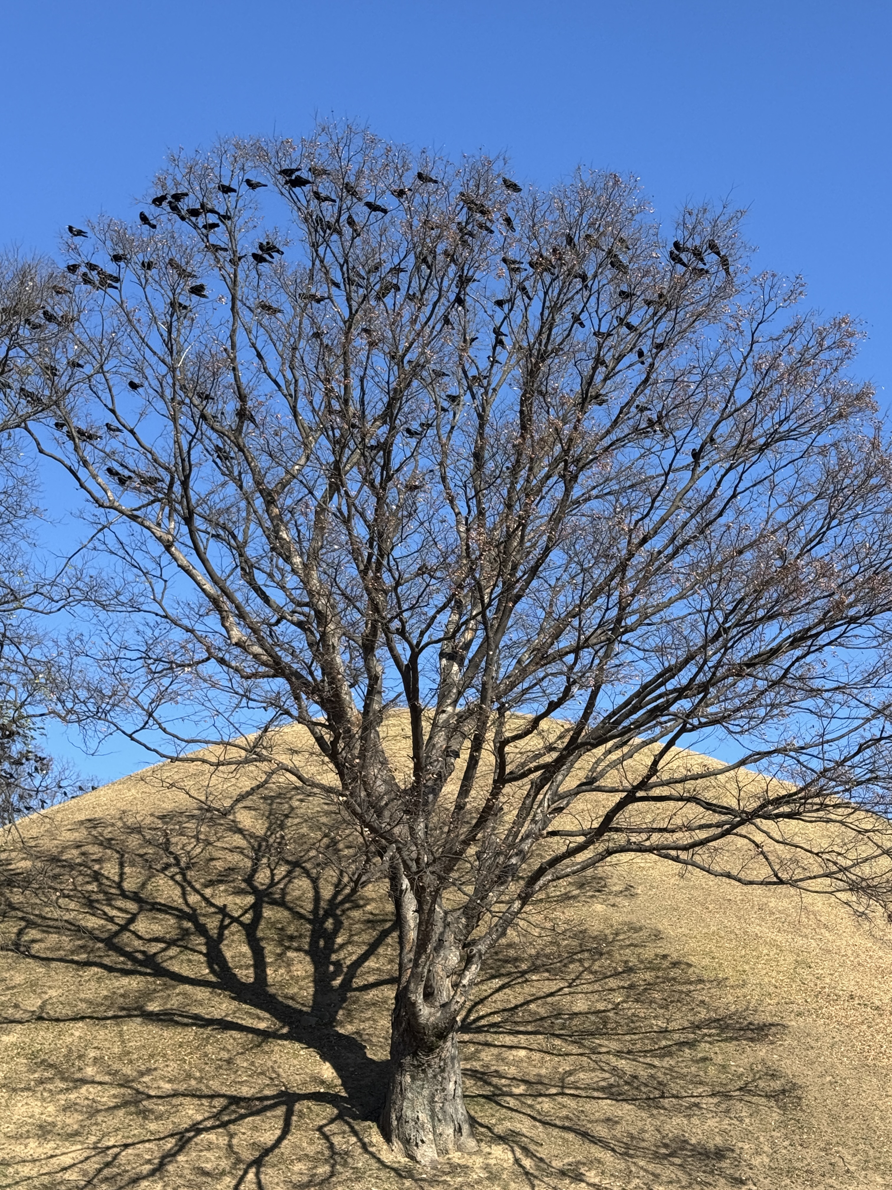 ▼有一座坟包的树上聚满乌鸦,但不知道坟包里埋的是谁(未发掘古陵墓)