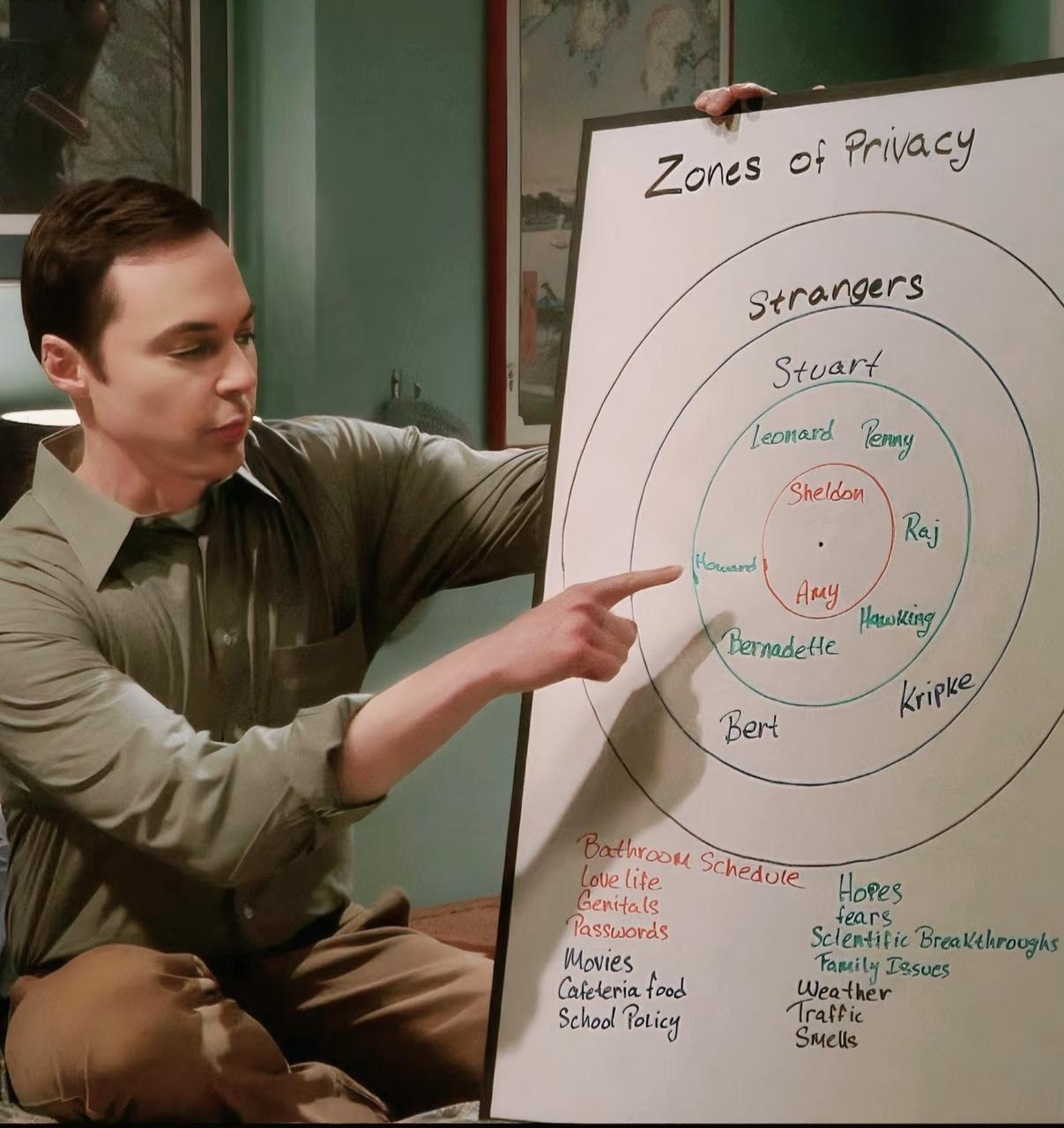 我们聊到了《生活大爆炸》里谢耳朵画的那张隐私地图,用几个圆圈就把人和人之间微妙的距离感讲得明明白白。也借用了心理学家内德拉的框架,把生活中那些让人隐忍着累、憋着难受的瞬间,分成了六种最常失守的边界。