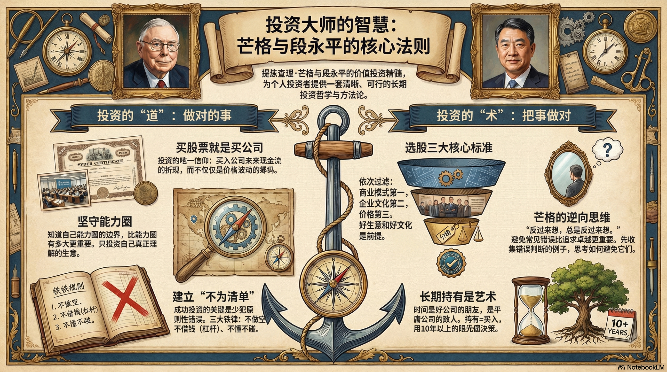 - 投资领域的三大铁律:不懂不碰: 绝不投资自己不理解的生意,这是避免犯大错的首要原则。