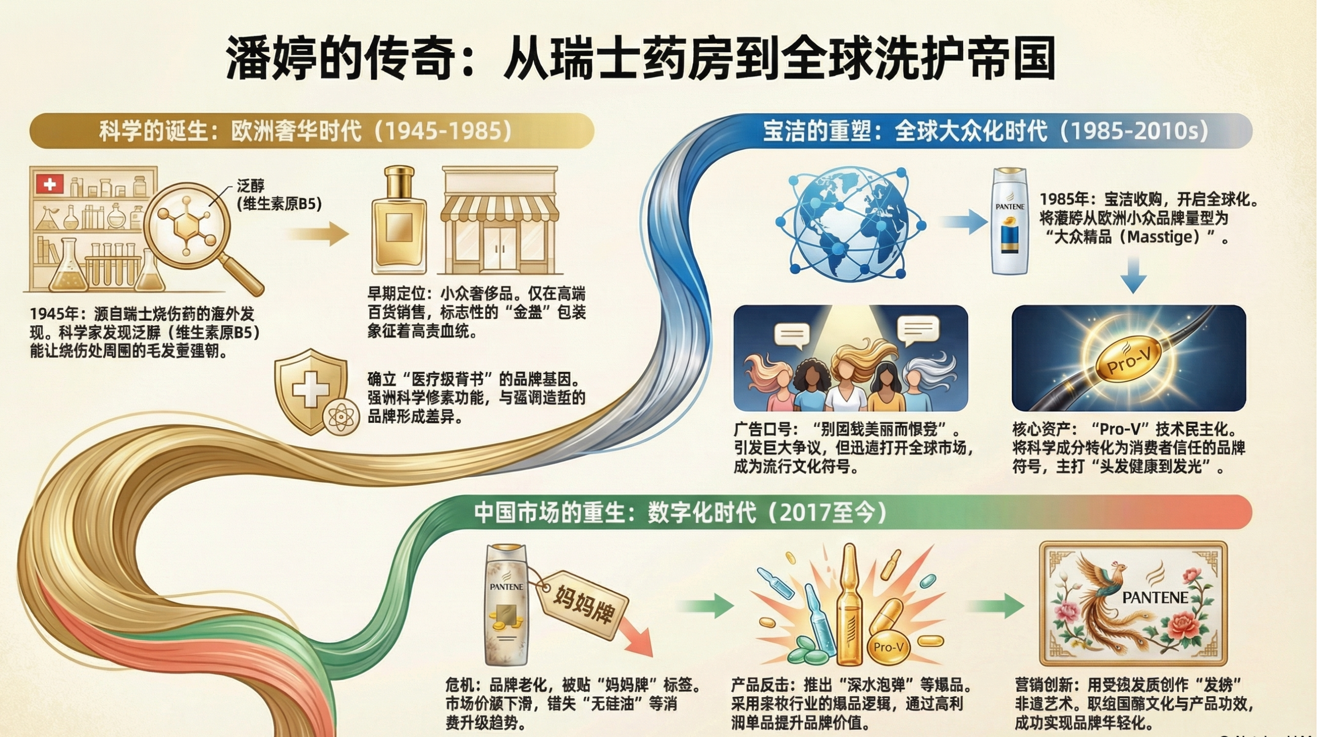 - 关键论点:潘婷诞生于二战时期瑞士霍夫曼罗氏制药实验室,最初是为了治疗烧伤而研发的药膏。在研发过程中,意外发现其核心成分“泛醇”(维生素原B5)能使毛发浓密强韧,从而促成了潘婷护发品牌的创立,赋予其“医疗级”的基因,专注于修复和健康。