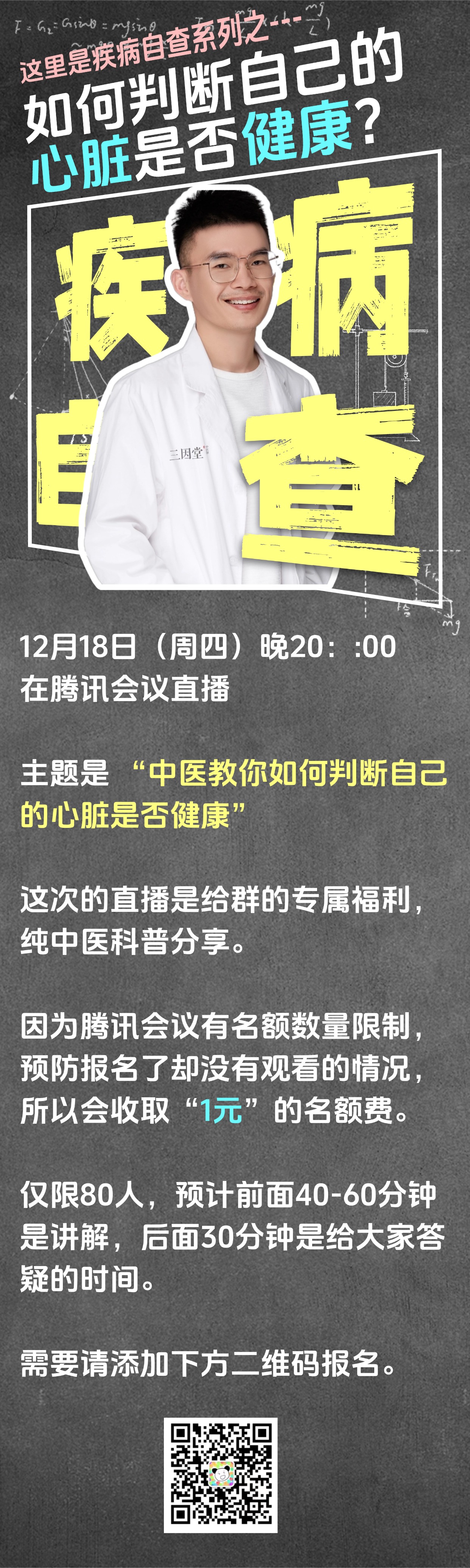 另外,本周四,也就是12月18日,张医生会有一个直播讲座,主题是“中医教你如何判断自己的心脏是否健康”,里面涉及到很多实用类知识,大家感兴趣可以添加运营微信,sytwwhm 报名,添加时请备注播客。