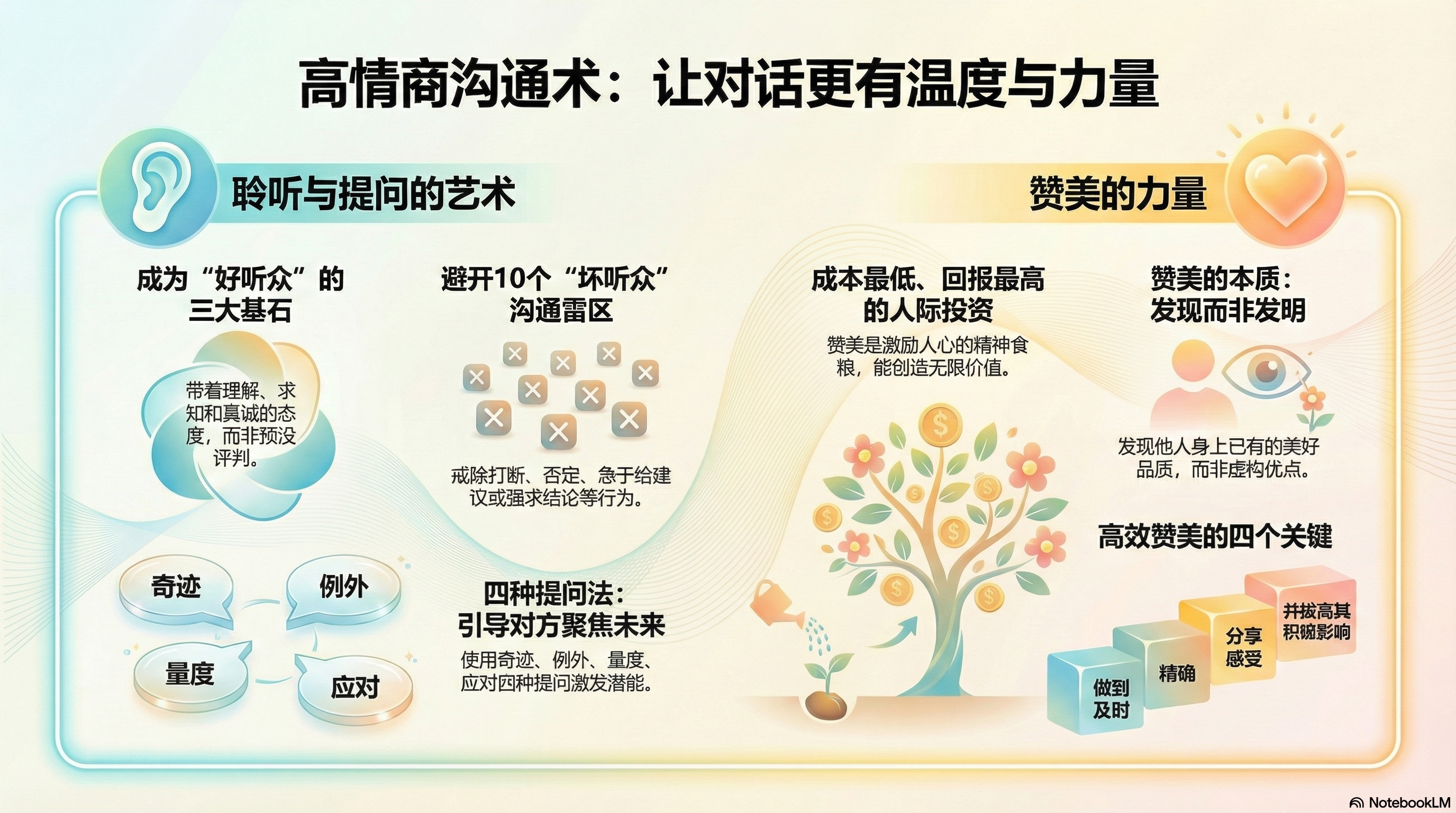总之,掌握面向未来的“奇迹提问”和以人为本的“精准赞美”,并辅以高情商的非语言技巧和深度倾听,是实现高效、有温度、目标导向型对话的实战核心。
