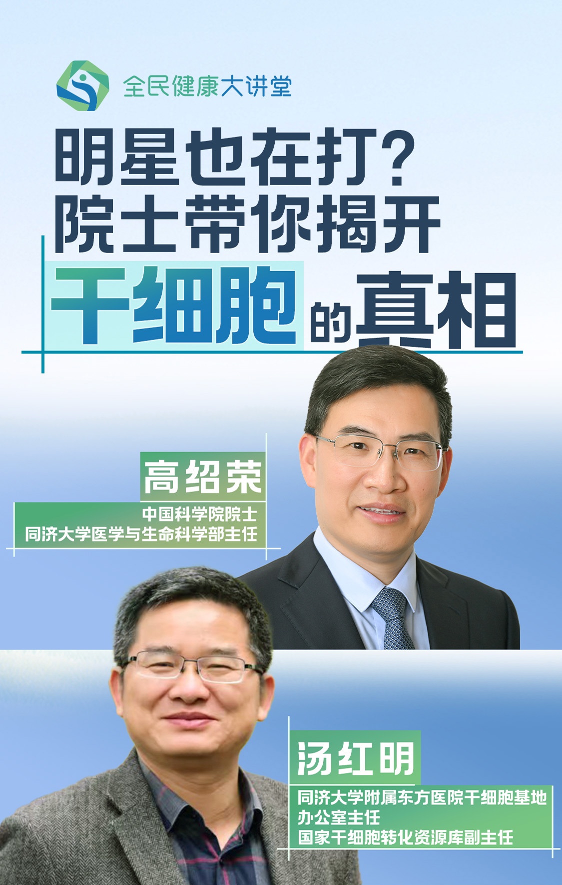 社交媒体上,明星靠干细胞疗法“逆龄生长”的故事层出不穷,它更被一些“高端健康圈”奉为“终极密钥”。但这究竟是生命科学的重大突破,还是被过度包装的消费陷阱?本期《全民健康大讲堂》特邀中国科学院院士、同济大学医学与生命科学部主任高绍荣,同济大学附属东方医院干细胞基地办公室主任、国家干细胞转化资源库副主任汤红明,带你揭开真相。