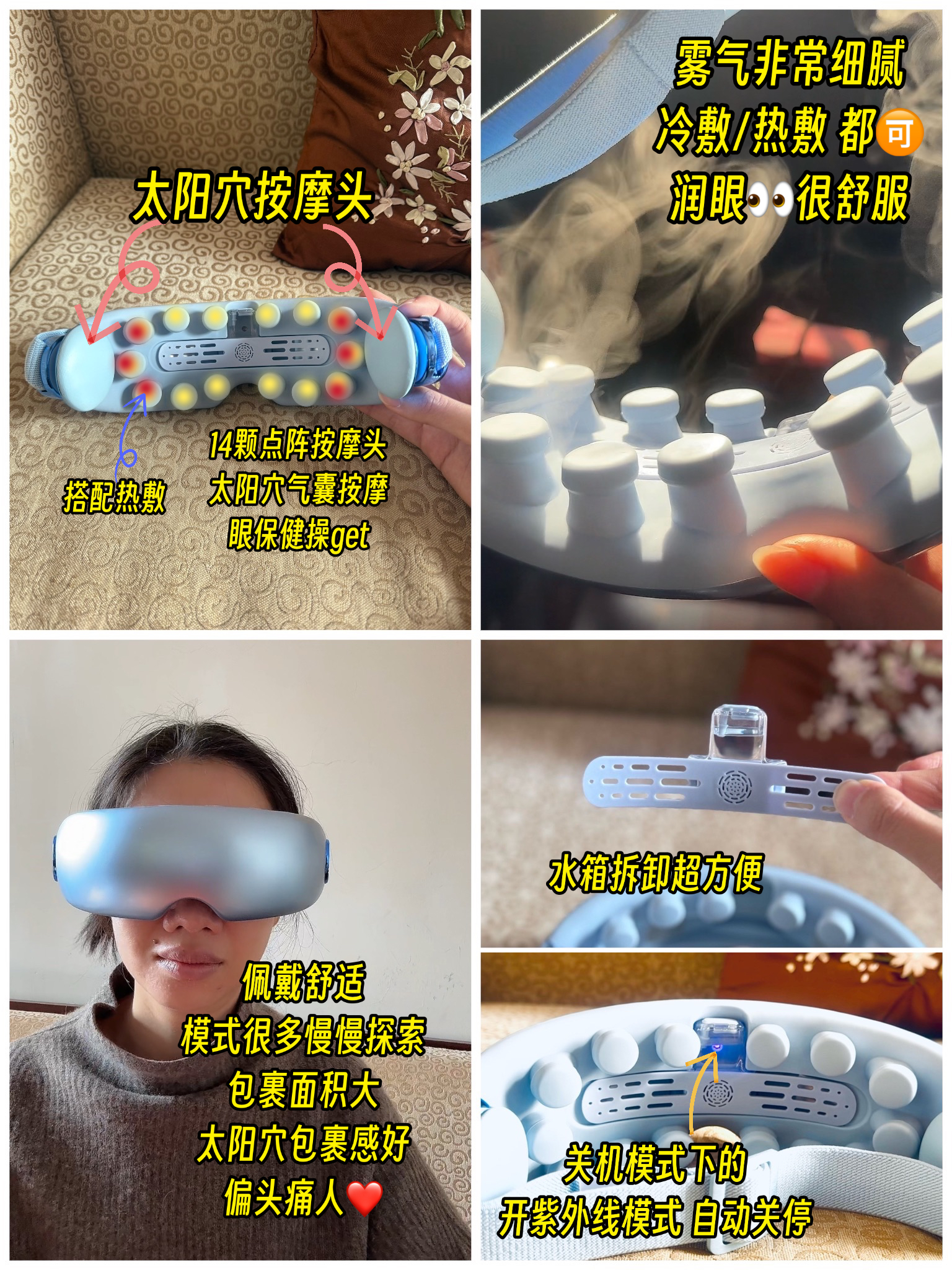 每天午休或者睡前抽出一会儿雾化按摩热敷一下,摘下来明显感觉眼睛润了很多,看东西都更清晰了。专业级的眼保健操穴位按的很准,大脑和眼睛同时放松一下,能更好的入睡