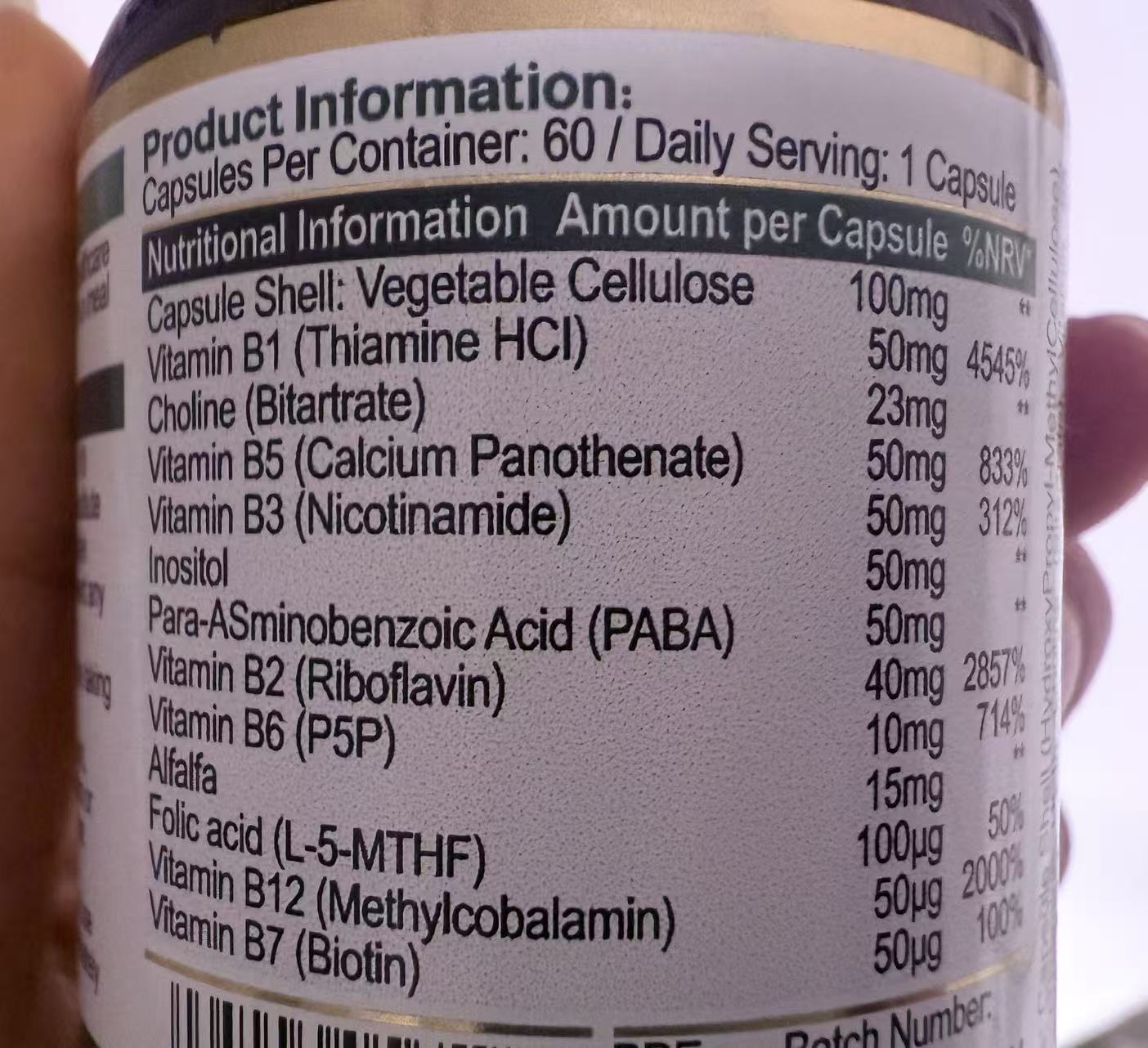 拿我的B族补剂举例:其中B1、B2、B5是标准形式;B6是活性形式P5 P,B9和B12都是甲基化形式,也就是活性形式。B3用的是烟酰胺,相较于盐酸更趋向于活性形式,并且不会引发潮红或者皮肤瘙痒。其中B7生物素本来就是活性形式