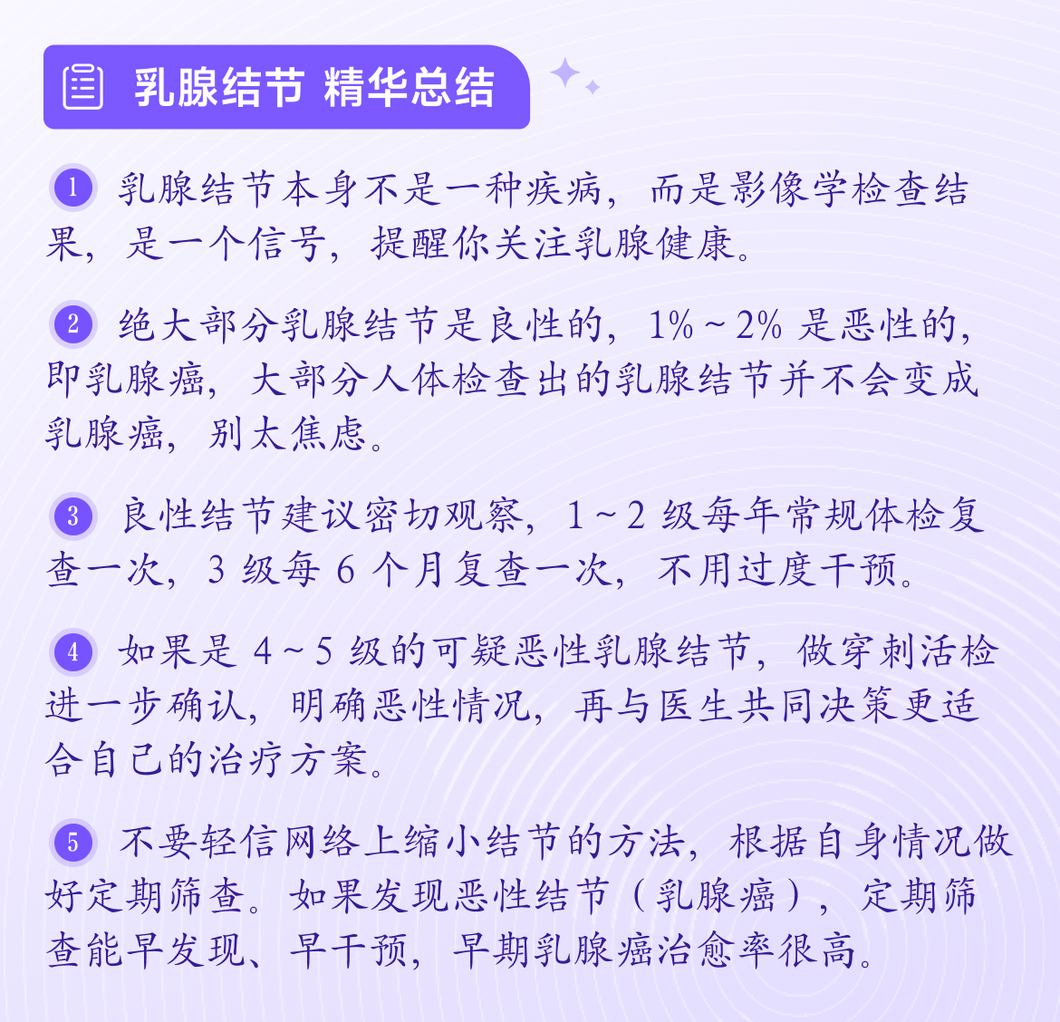 现代医学的目的不在于消灭所有乳腺结节,而在于精准识别,并通过完善的解决方法,让发生乳腺结节的女性,能够做出最利于自己身心健康的决策。