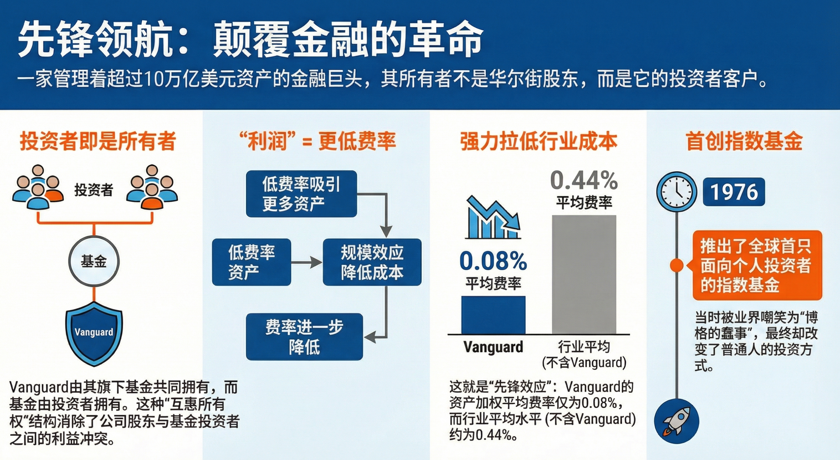 - 核心议题:先锋领航如何通过“按成本运营”和推出世界上第一支面向个人投资者的指数基金,为投资者创造价值,并挑战华尔街的传统观念。
