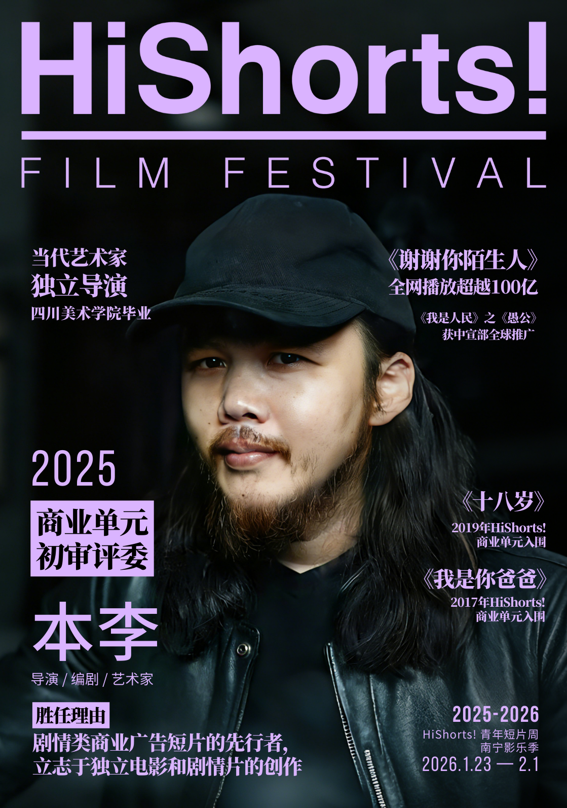 本李,导演、编剧、艺术家。毕业于四川美术学院,早期拍摄实验短片与独立电影,后转型商业故事广告。作品《十八岁》入围2019年HiShorts!商业单元。2017年自导自演《我是你爸爸》引爆网络,其后连续打造《31岁高中生》《朋友圈无朋友》《舌根上的男孩》等多部现象级爆款短片,屡获行业金奖。其作品《谢谢你陌生人》系列播放量超100亿,《我是人民》之《愚公》被中宣部全球推广,以强烈精神共鸣与社会洞察创作出众多行业经典作品。