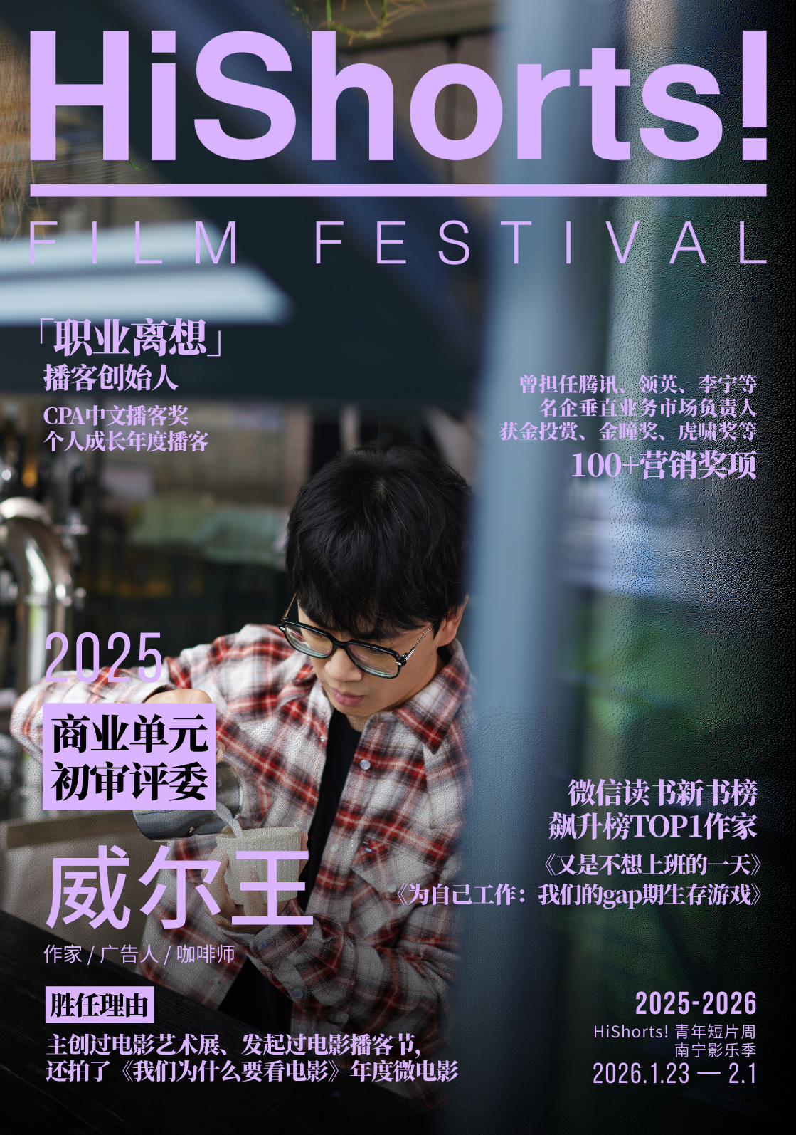 威尔王,青年作家、广告人、咖啡师、播客「职业离想」主播、北京民艺非遗研究院研究员。作家:书籍《又是不想上班的一天》荣登微信读书飙升榜、新书榜TOP1,最新作品《为自己工作:我们的gap期生存游戏》。广告人:任职微软、腾讯等公司市场部。先后担任LinkedIn领英中国短视频负责人、腾讯视频动漫、游戏、电竞、NBA市场负责人,代表作:《我们为什么要看电影》微电影、《孤勇者》营销,担任数英奖、金瞳奖、虎啸奖等10+个主流广告节评委,获得金投赏、金瞳奖金奖在内100+个主流广告奖。播客主播:「职业离想」荣获2025CPA中文播客奖年度个人成长类播客,「造梦现场电影播客节」发起人,36氪、虎嗅、中国财经报等媒体报道,时尚杂志《风度men's uno》专题报道。