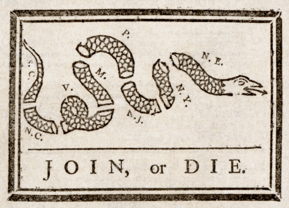 Join, or Die 联合或灭亡,弗兰克林为1754年联合会议创作的漫画