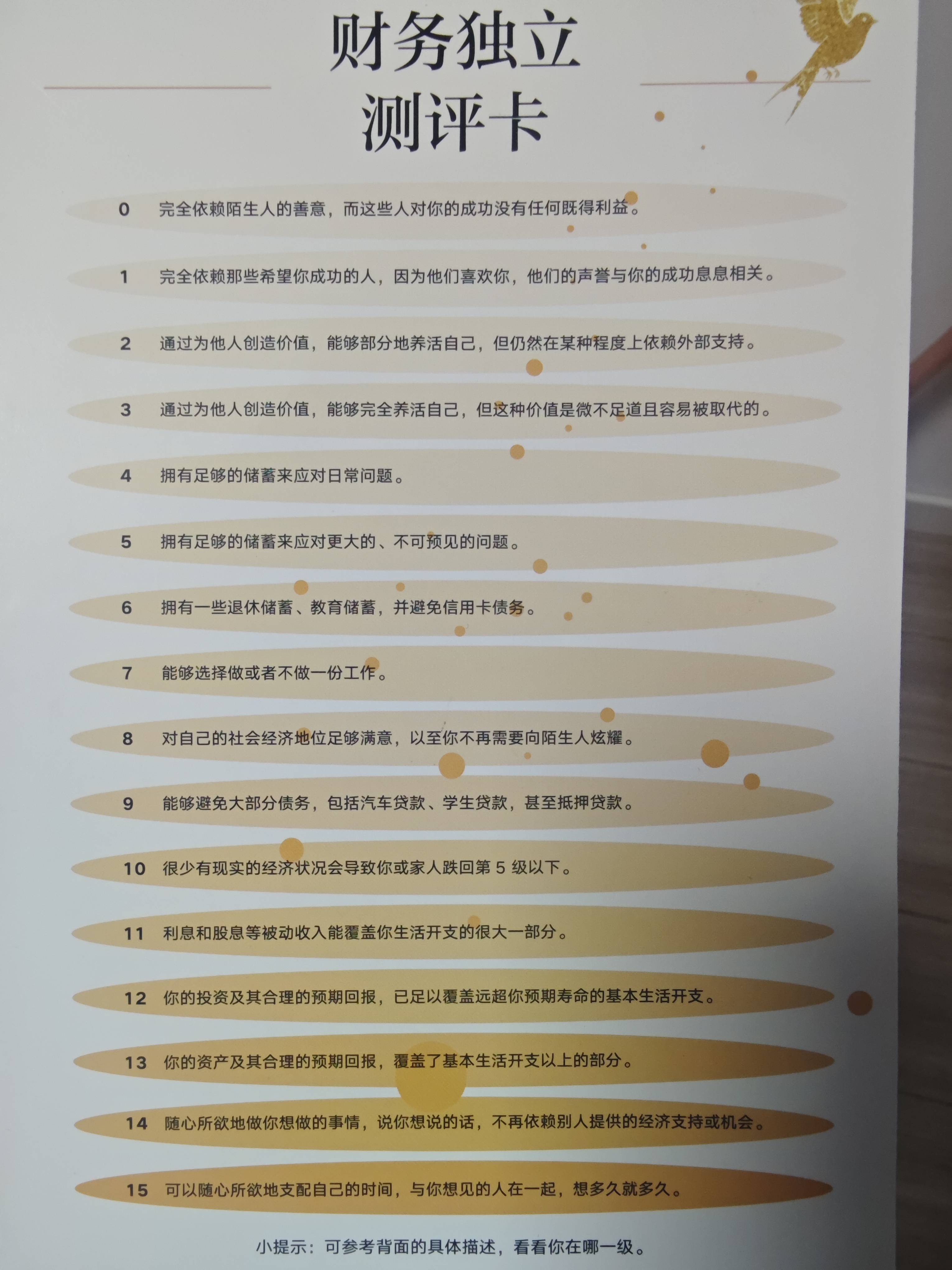 大家好,我是百合。欢迎收听幸福实验室新一期的播客节目。这一期,我们继续聊一聊《金钱的艺术》这本书,在这本书里,侯赛尔把财务自由划分了0-15个层级,来看看你是在哪一层吧。