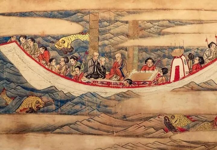 第三次东渡更为惊险。744年冬天,鉴真一行绕道浙江,从宁波出海,却遭遇狂风暴雨,船只被吹至舟山群岛,漂流数月后才靠岸。此时,同行弟子有的畏惧退缩,有的患病去世,荣睿也病逝于途中,东渡队伍元气大伤。