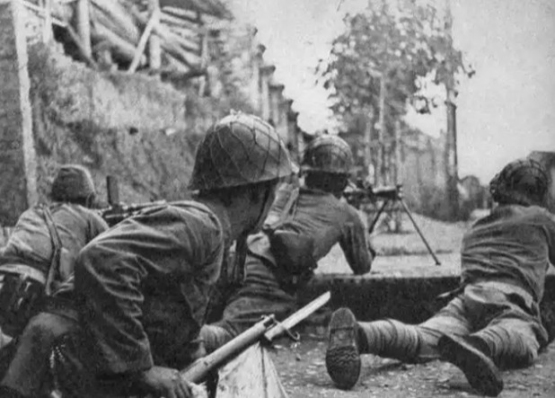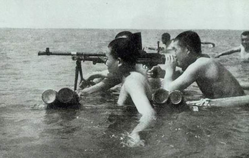 我党解放军渡海作战前,机枪架在竹排上,练习水上射击的战士
