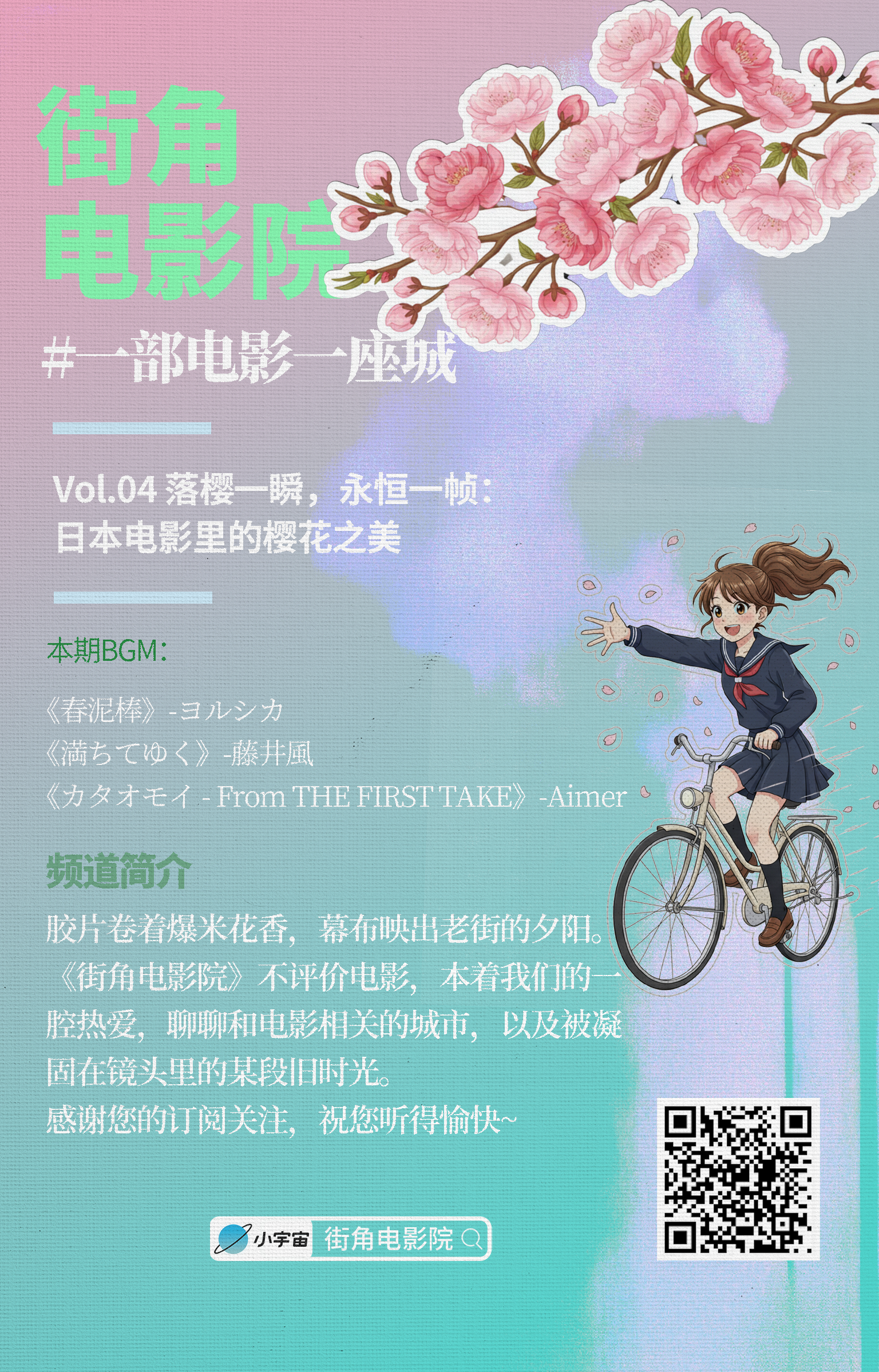 这一期我们讨论了日本电影中的樱花意象以及背后的日本文化和“物哀”思想,从岩井俊二的《花与爱丽丝》《四月物语》、新海诚的《秒速5厘米》、还有《余命十年》《小森林冬春篇》等电影作品到现实生活中的樱花情节进行了深入分享。如果说,我们在荧幕上看到的是樱花影像诗,那在真实的日本生活中,樱花早已超越了自然的定义,其背后的物哀之美,更是早已融入日本文化的精髓之中。
