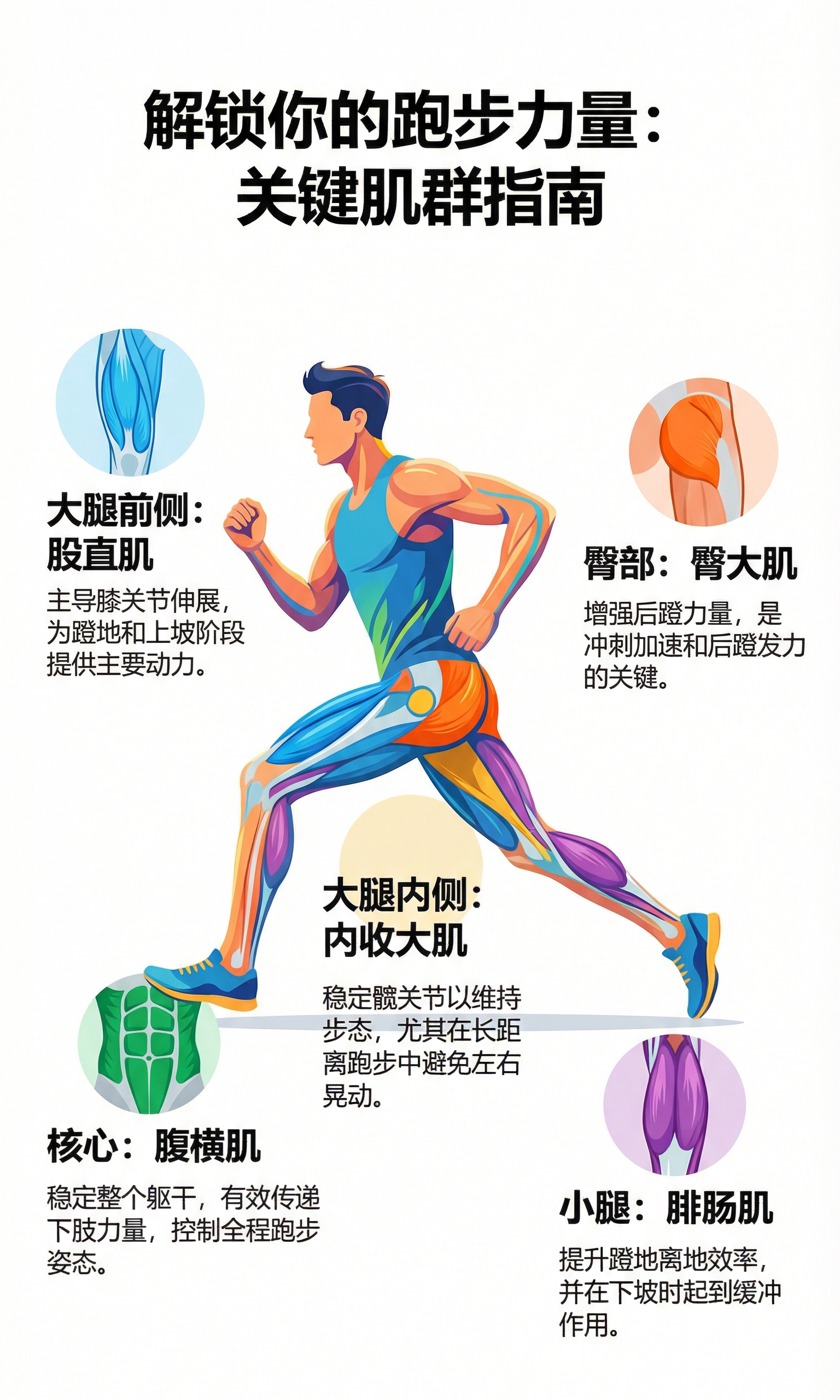 - 这些肌肉分别在膝关节伸展、髋关节稳定、后蹬力量、踝关节辅助和躯干稳定中发挥关键作用。