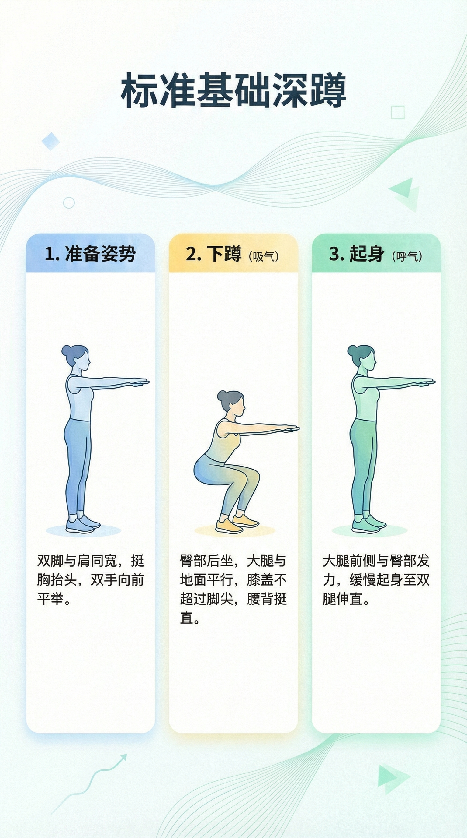 - 包含三种核心动作:标准基础深蹲(30个,3组)、窄距激活深蹲(15个,2组)和跑步热身深蹲(5个,1组)。