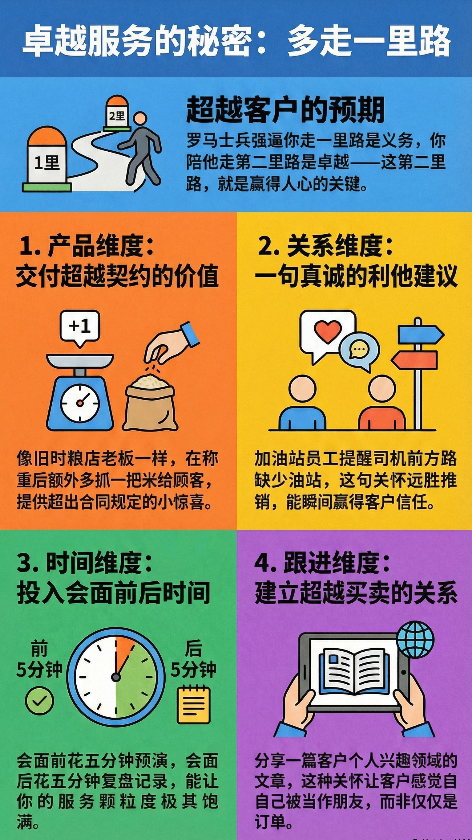 在商业竞争的广阔赛道上,企业往往面临着两种截然不同的增长路径选择。一种是向外看,这被称为“拓新”,即我们之前探讨过的“走加利利”策略,去寻找那些尚未被满足的需求,去开垦未知的处境;另一种是向内看,即深耕现有的客户存量,通过极致的服务体验,挖掘客户的全生命周期价值。然而,卓越服务并非易事。它要求我们突破常规的商业思维,从单纯的“契约精神”迈向更高维度的“恩典精神”。本期专题我们将以“多走一里路”为核心理念,深入剖析服务老客户面临的四大挑战,并提供一套在产品、跟进、关系、时间和生命五个维度上践行卓越服务的实战方法论。