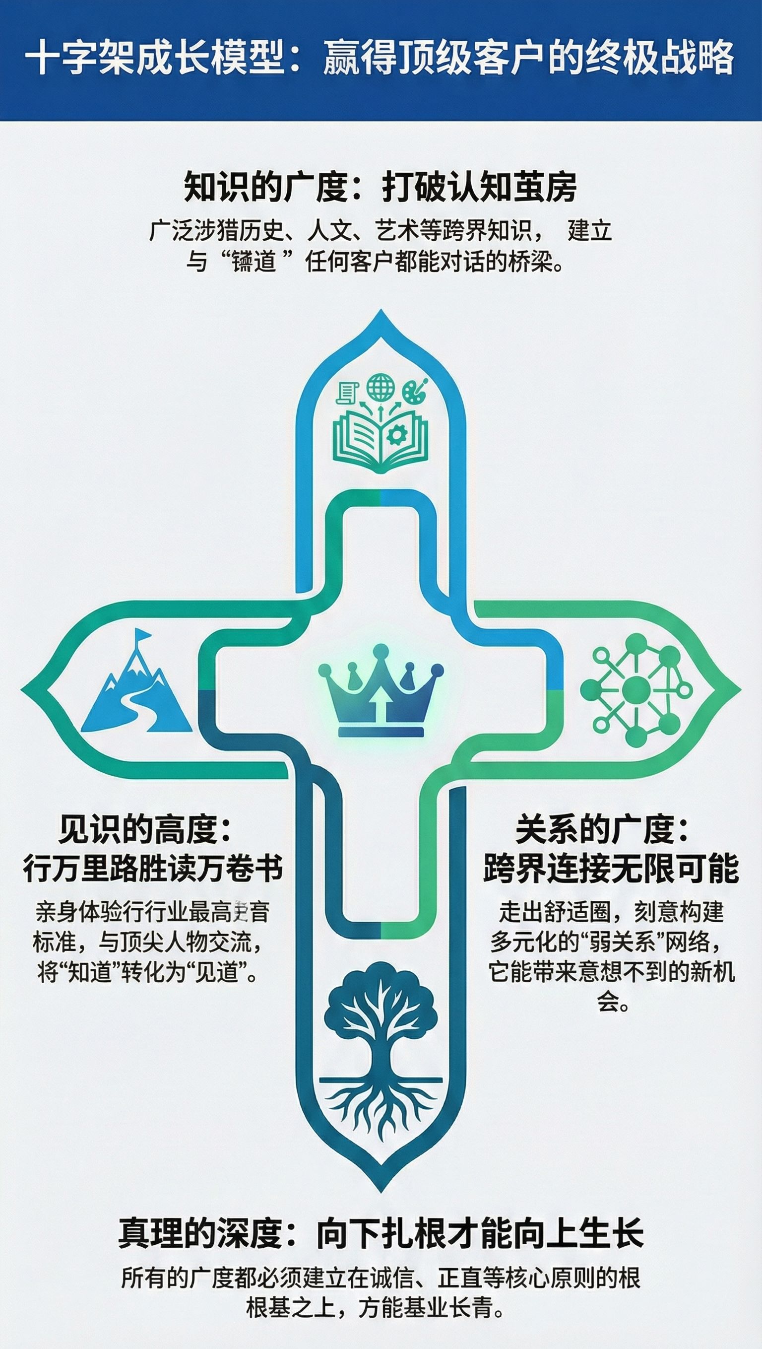 在商业的高阶赛场上,客户购买的往往不仅仅是产品本身,更是销售者或合作伙伴所展现出的眼界、格局与智慧。当你的认知水平无法覆盖客户的关注点时,无论你的产品多么优秀,你都很难成为他平等的对话者,更无法成为他的战略伙伴。这不仅仅是个人素质的提升,更是一种商业战略。当你拥有了广度,你就拥有了更多的“连接点”。每一个知识点、每一段阅历、每一层关系,都可能成为你与客户建立深度信任的锚点。本期专题节目我们将深入探讨如何通过系统性的自我提升,打破认知的茧房,构建宏大的格局,从而以一种从容、博学且富有洞察力的姿态,赢得客户由衷的敬重与追随。