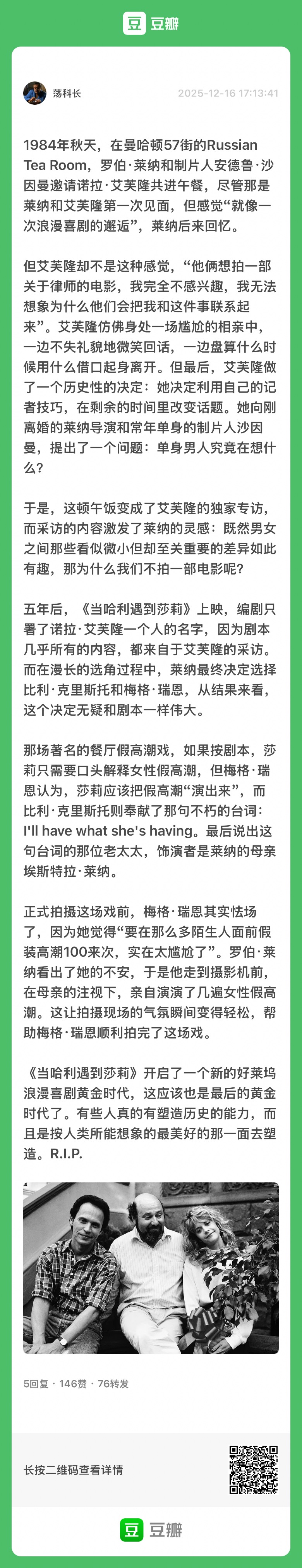 封面:当哈利遇到莎莉 When Harry Met Sally... (1989)念头:R.I.P 罗伯·莱纳导演夫妇疑似被其子所杀言语A:詹姆斯·鲍德温《乔瓦尼的房间》言语B:罗伯·莱纳《当哈利遇到莎莉》音乐:Paul Simon《Horace And Pete》 Colbie Caillat《友谊地久天长 Auld Lang Syne》