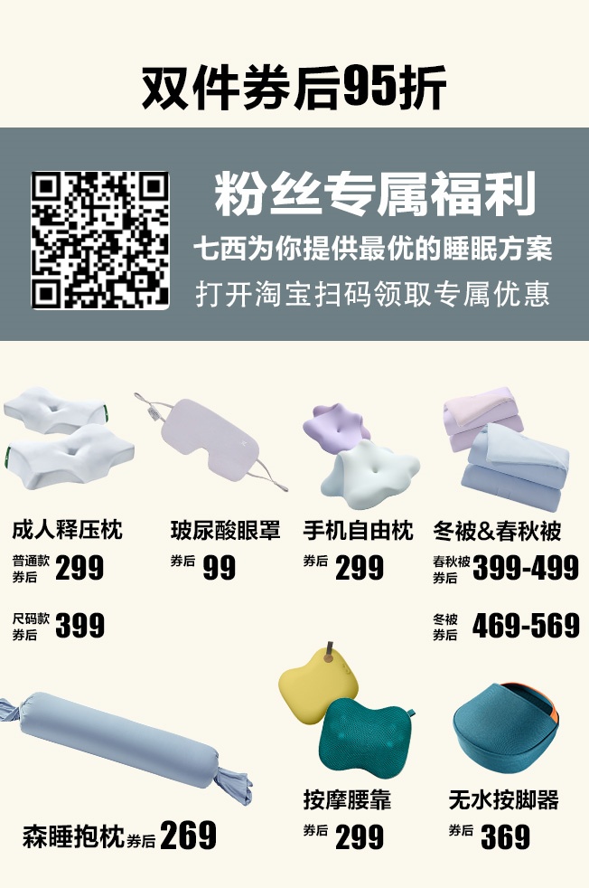 需要他们家「七西枕头」优惠的听友们这次也可以关注一下,枕头是有科学分区的设计,更适合颈椎生理曲线,不会让你睡醒肩颈酸痛,落枕,实现翻身自由,可以快速进入深睡眠状态;独特的分码设计可以根据人体的身高体重,头围肩宽选择适合自己的睡眠枕,平时睡不好,肩颈不好的可以去了解看看。