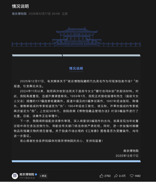 大家好,我是闲聊艺术的小闲,这期的节目也是一等再等,也算是临时插播。最近有个热点事件,我也是吃瓜吃的很香,所以准备蹭个热点,跟大家聊聊。就是这几天一直在说的南京博物院仇英的《江南春》为何会出现在拍卖品市场的事儿。