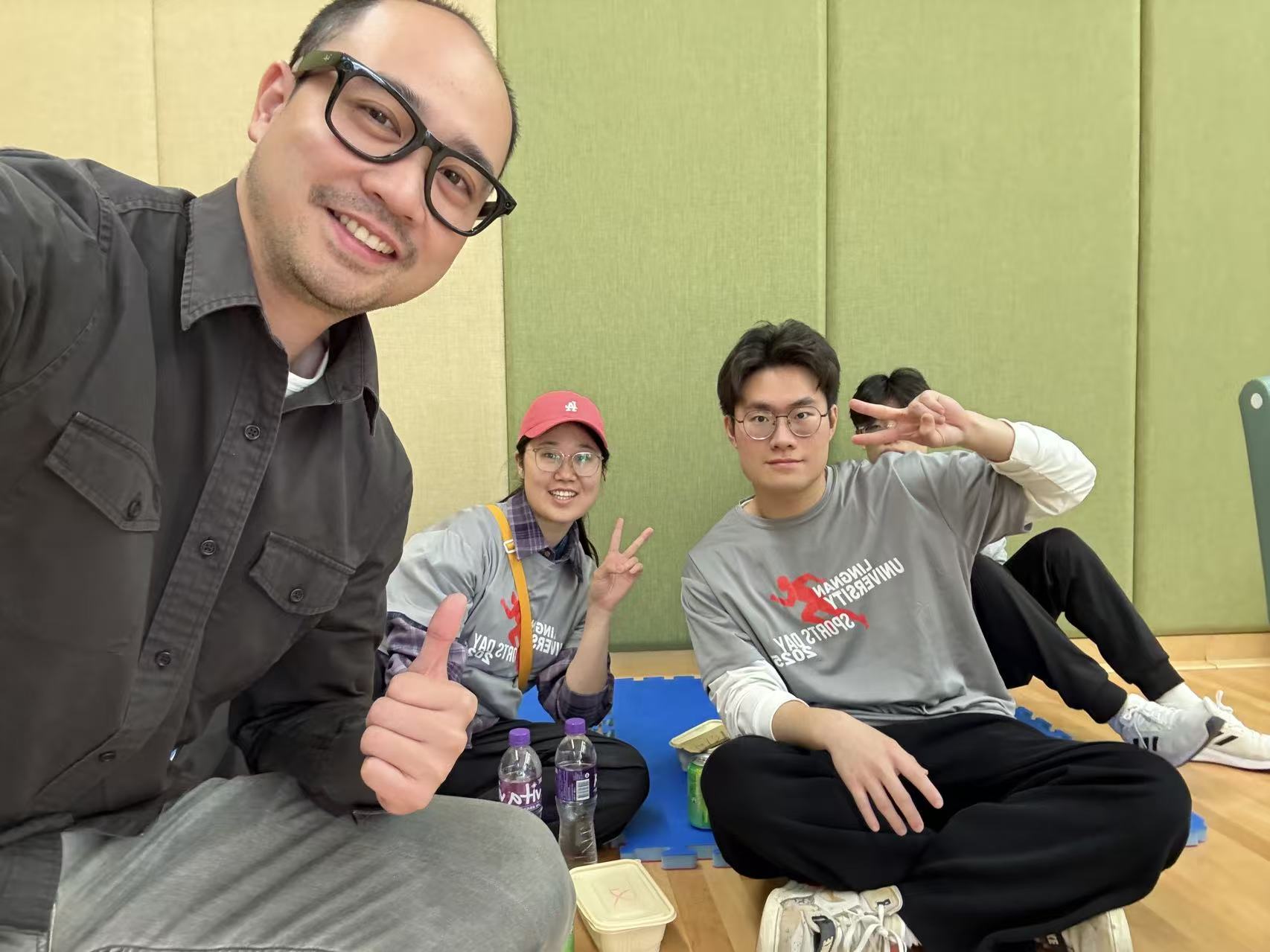 (图3,2025年2月20日春,慰问参加校运动会的志愿者,仅两位——佳琪和沁骏,我们在运动场边上的体育场内合影)