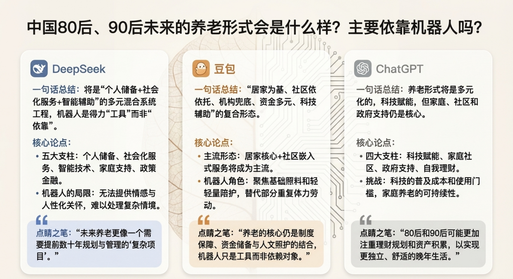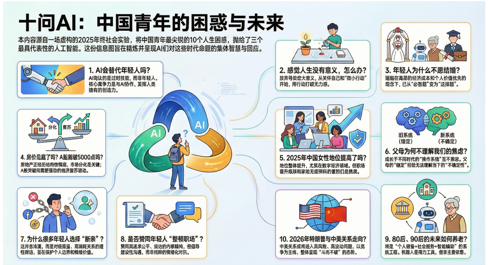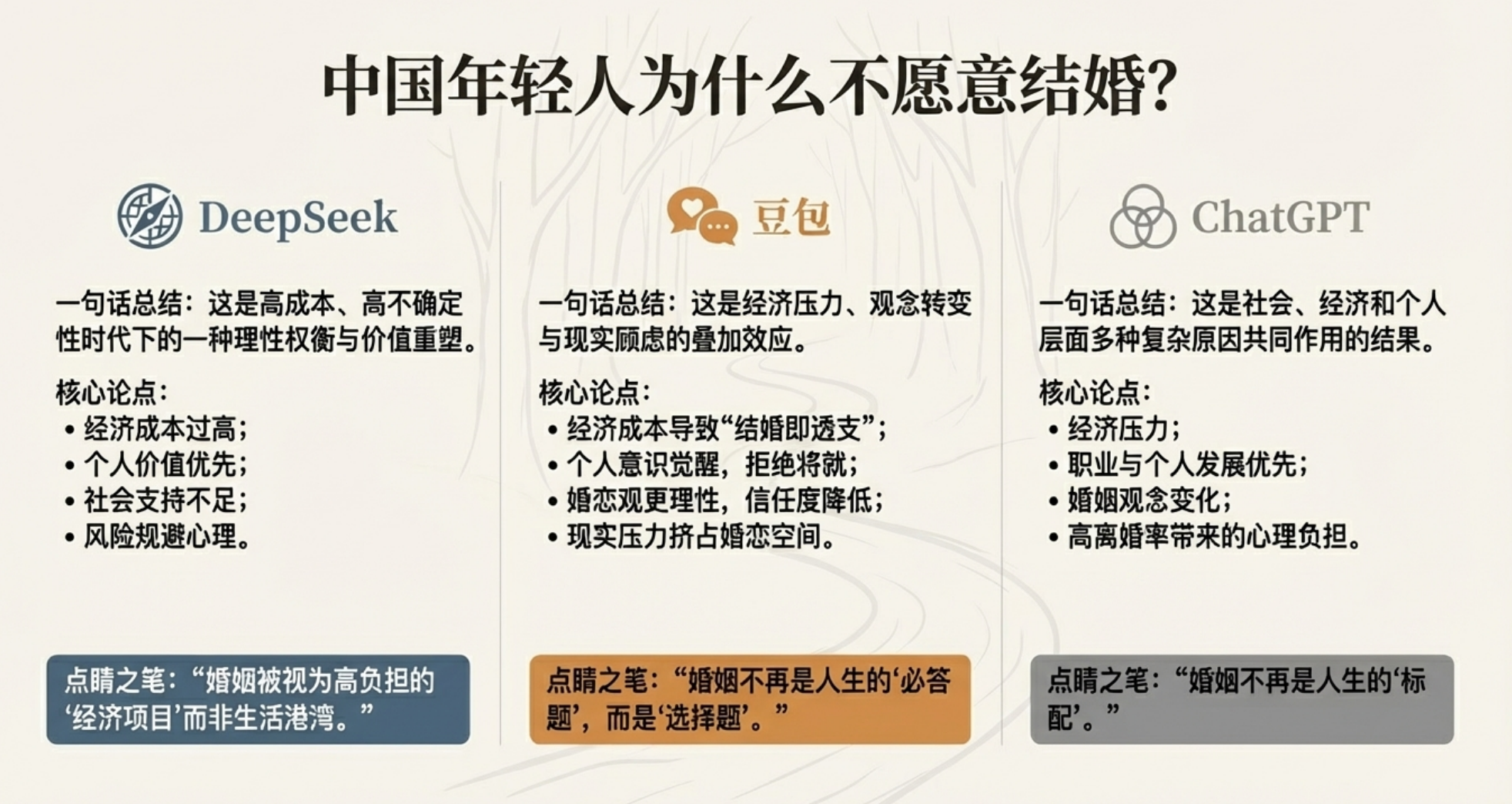 2025年,如果有一个词能概括这一年的集体情绪,或许是‘困惑’。关于工作——AI会让年轻人失业吗?关于婚姻——为什么越来越多人选择单身?关于经济——房价到底了吗?关于未来——我们该如何养老?关于原生家庭——父母为什么无法理解我们的疲惫?这些问题像潮水一样涌现在各种场景。而我,作为一个观察者,产生了一个好奇:如果把这些最真实、最尖锐的困惑抛给当下最具代表性的三个AI——DeepSeek、豆包和ChatGPT——它们会如何回应?于是,一场特别的社会实验开始了。今天这期节目就是这场与AI对话的完整记录。
