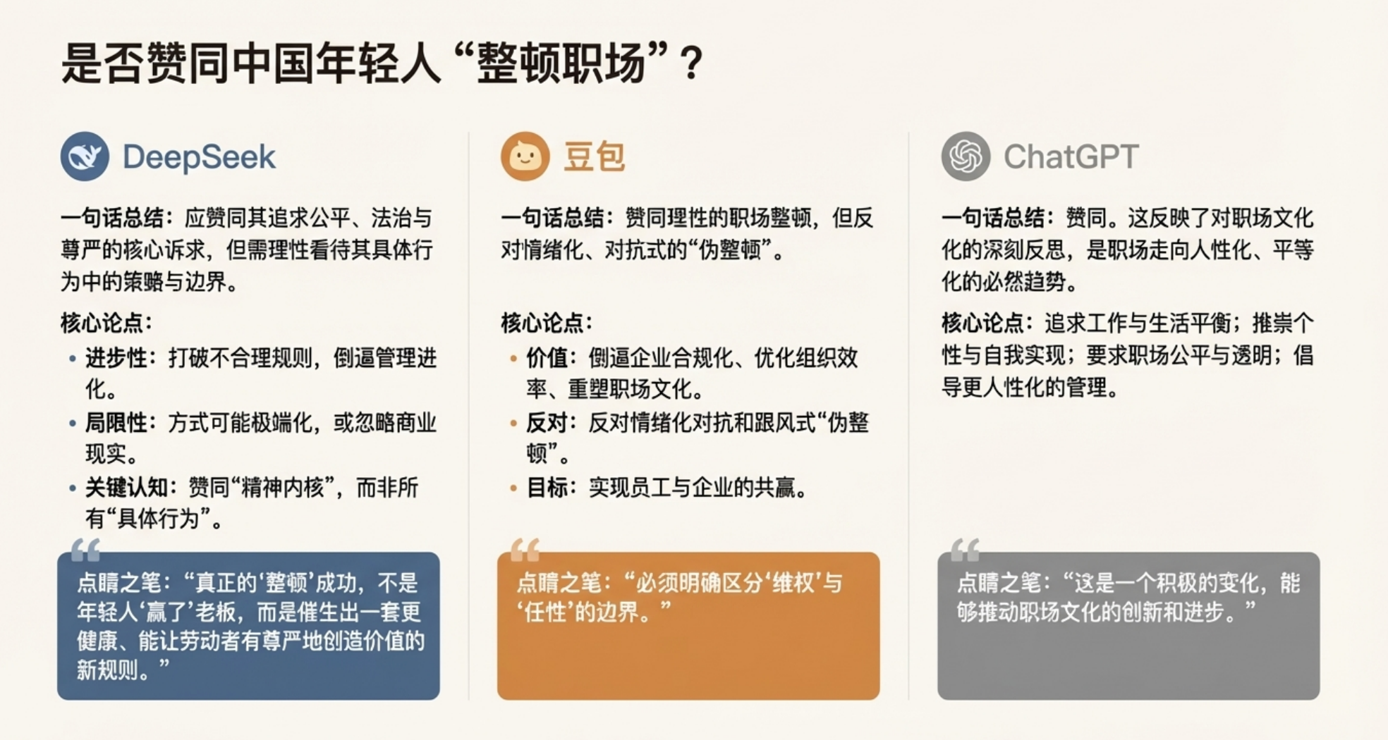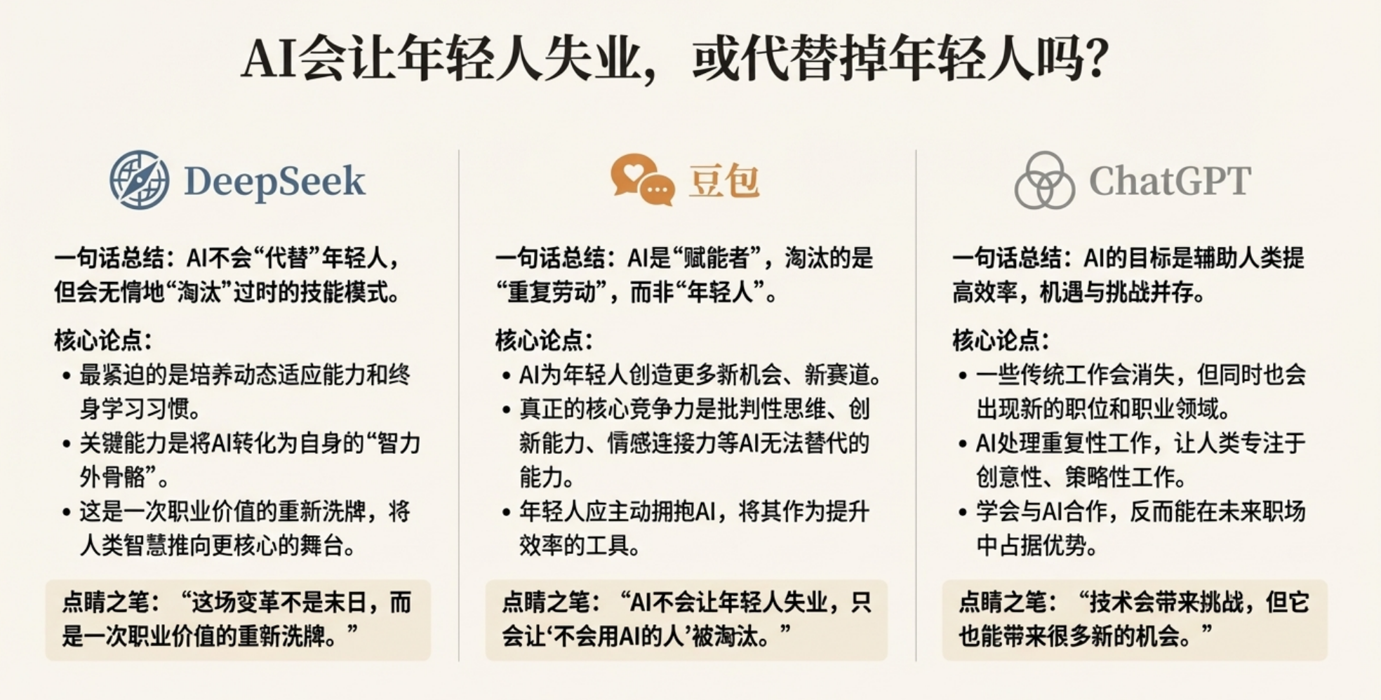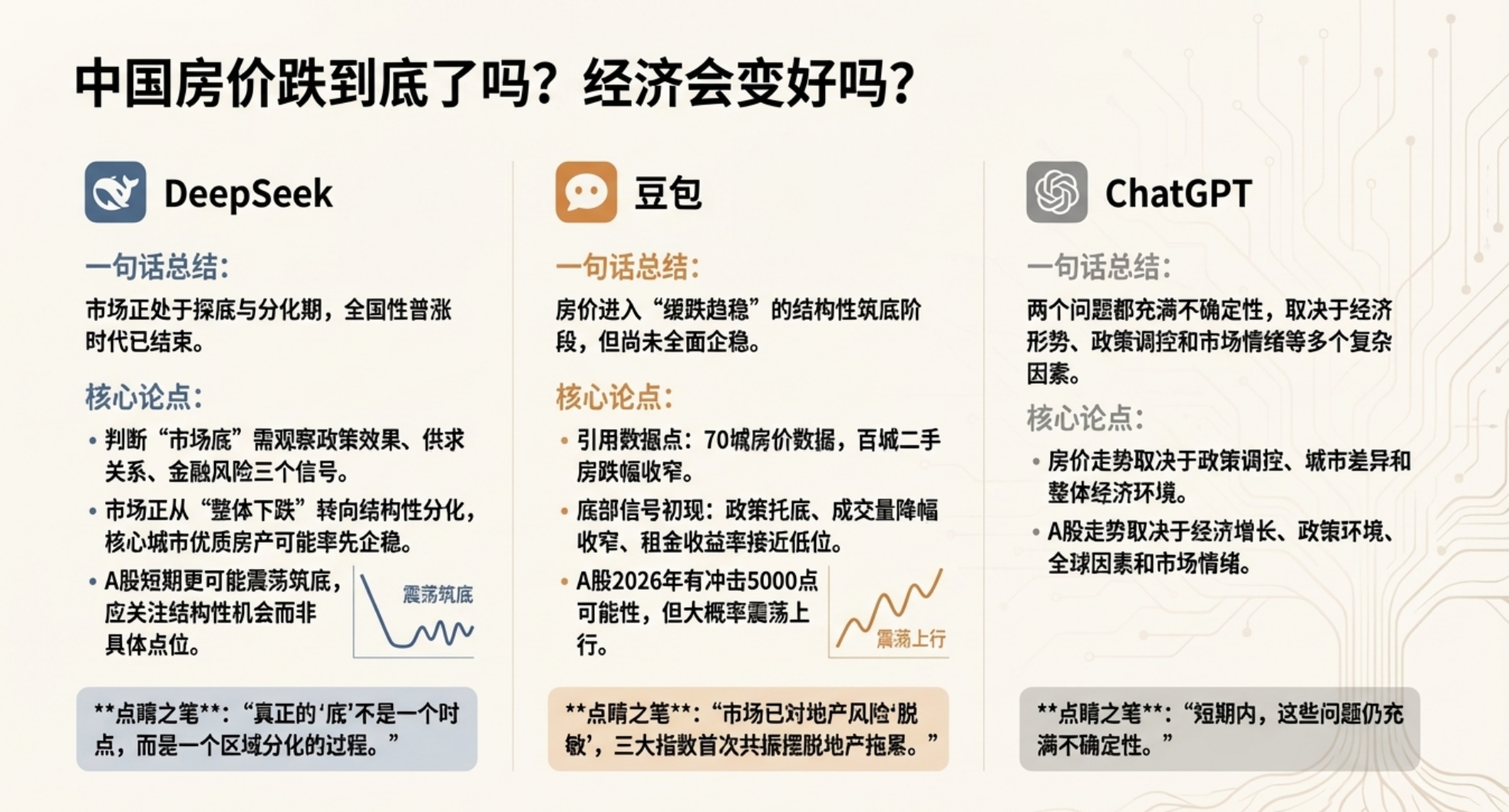 2025年,如果有一个词能概括这一年的集体情绪,或许是‘困惑’。关于工作——AI会让年轻人失业吗?关于婚姻——为什么越来越多人选择单身?关于经济——房价到底了吗?关于未来——我们该如何养老?关于原生家庭——父母为什么无法理解我们的疲惫?这些问题像潮水一样涌现在各种场景。而我,作为一个观察者,产生了一个好奇:如果把这些最真实、最尖锐的困惑抛给当下最具代表性的三个AI——DeepSeek、豆包和ChatGPT——它们会如何回应?于是,一场特别的社会实验开始了。今天这期节目就是这场与AI对话的完整记录。