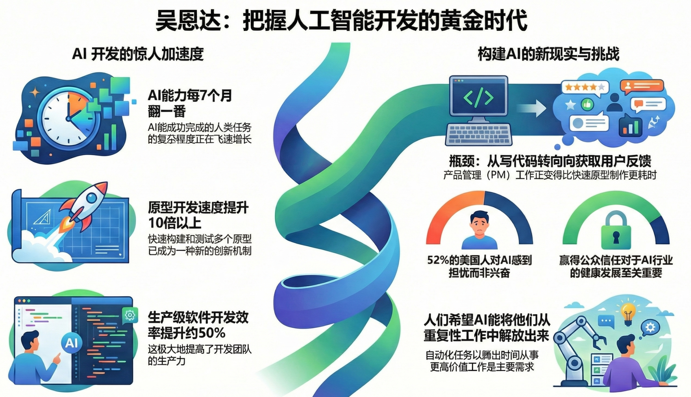 吴恩达在本次演讲中强调,人工智能的发展并未放缓,其处理任务的能力和编程效率正以惊人的速度提升。他指出,利用AI驱动的组件进行快速原型设计已成为创新的新机制,这使得开发者能以极低的成本筛选优质创意。随着开发效率的飞跃,软件开发的瓶颈正从代码编写转向获取用户反馈,甚至导致产品经理与工程师的配比趋向对等。尽管技术前景广阔,但他也对公众因负面宣传而产生的担忧心理表示遗憾,并呼吁行业通过解决实际痛点来重拾大众信任。最后,他鼓励从业者积极利用这些高效工具,在协作与交流中共同构建更有价值的AI应用。