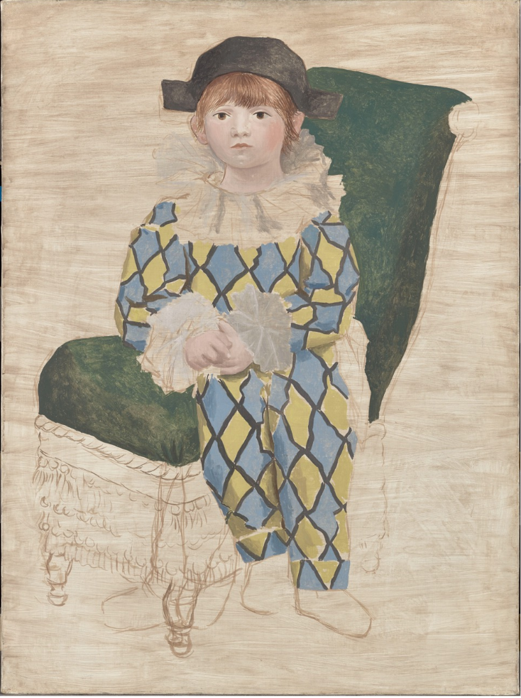 毕加索著名的那句话 “我花了四年时间画得像拉斐尔一样,但用一生的时间,才能像孩子一样画画。”他对儿童绘画方式的憧憬,也将童年作为绘画的主题之一呈现。并且经常有“小丑”元素出现在画面中。由于小丑服装的戏剧性和社会身份的强烈对比——生活不易还要取悦别人,让这个主题一直是我的最爱之一。展厅里展示的小丑是《穿小丑服装的保罗》中描绘的是他的儿子,蓝色黄色的小丑服和温柔的笔触,让小丑从社会议题回归了童年的单纯。展厅中Paul对画面中服装的提取也是神来之笔。