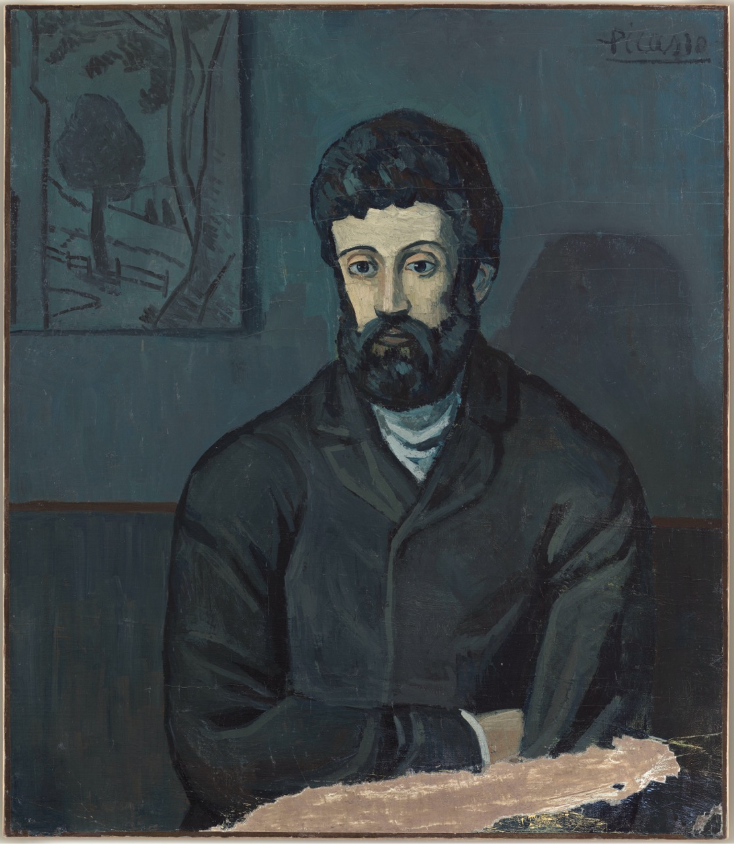 1901年毕加索的挚友卡洛斯·卡萨赫玛斯自杀后,毕加索的情绪也受到很大影响,这个时期的很多作品都异常阴郁,色调也很冷,被称为蓝色时期。这个时期的作品中经常可以看到一些看起来似乎在发呆的人物,用现在的话来说,有种“活人微死”的感觉。这个展厅中只有一幅作品《男人肖像》毕加索说这位是“类似街上常看到的疯子,巴塞罗那没人不知道他”毕加索借由画笔记录下了这样的社会边缘人,也有人文关怀。