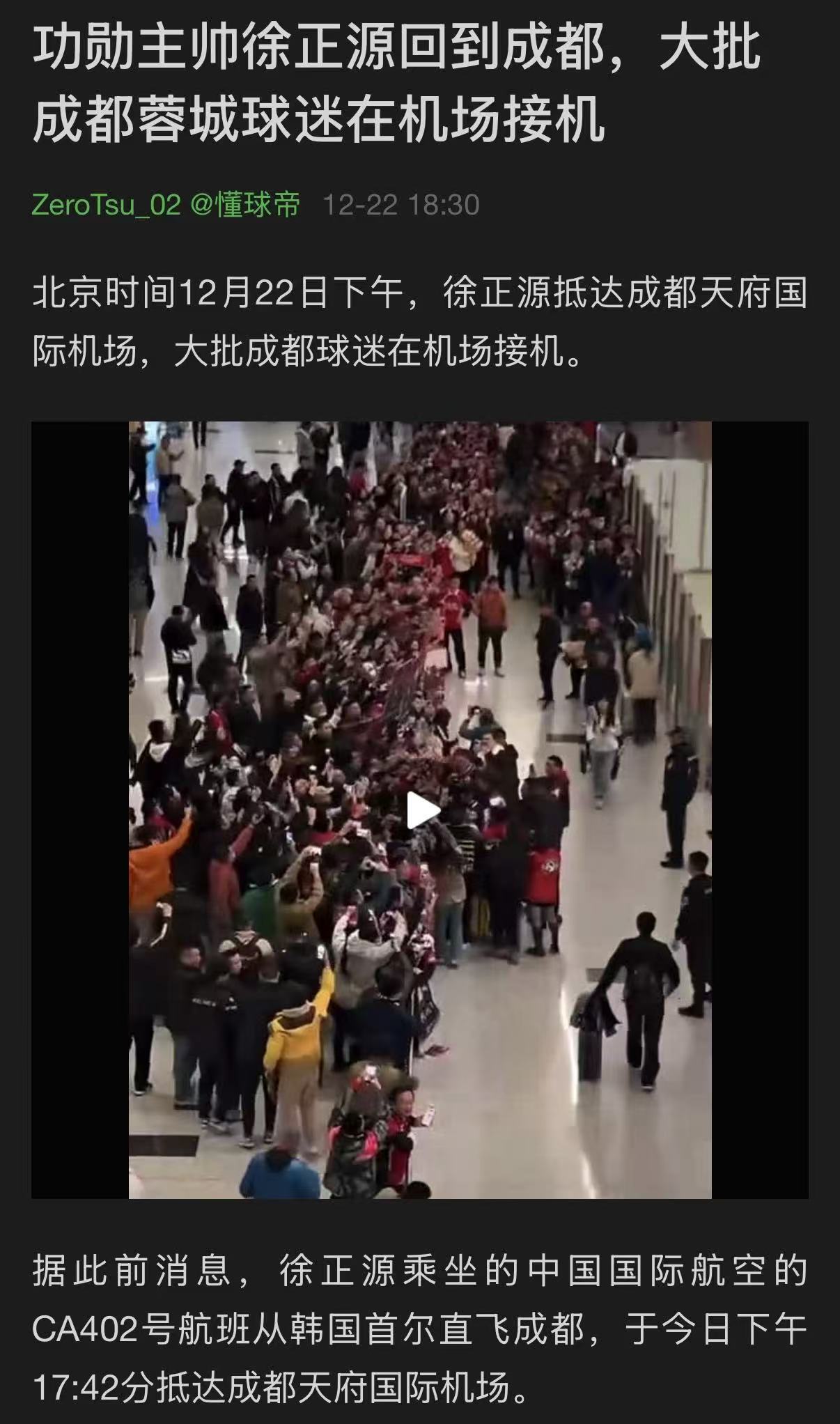 徐正源回成都,球迷自发组织接机