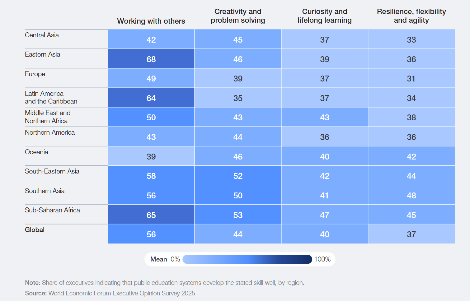 (不同地区教育系统对人文技能的培养情况,见研报第7页)显示,全球仅56%的高管认为教育系统能教好“协作能力”,而创造力、好奇心的培养满意度连一半都不到。撒哈拉以南非洲在创造力、韧性上表现突出,北美和大洋洲却栽在“团队协作”上,反差特别大。
