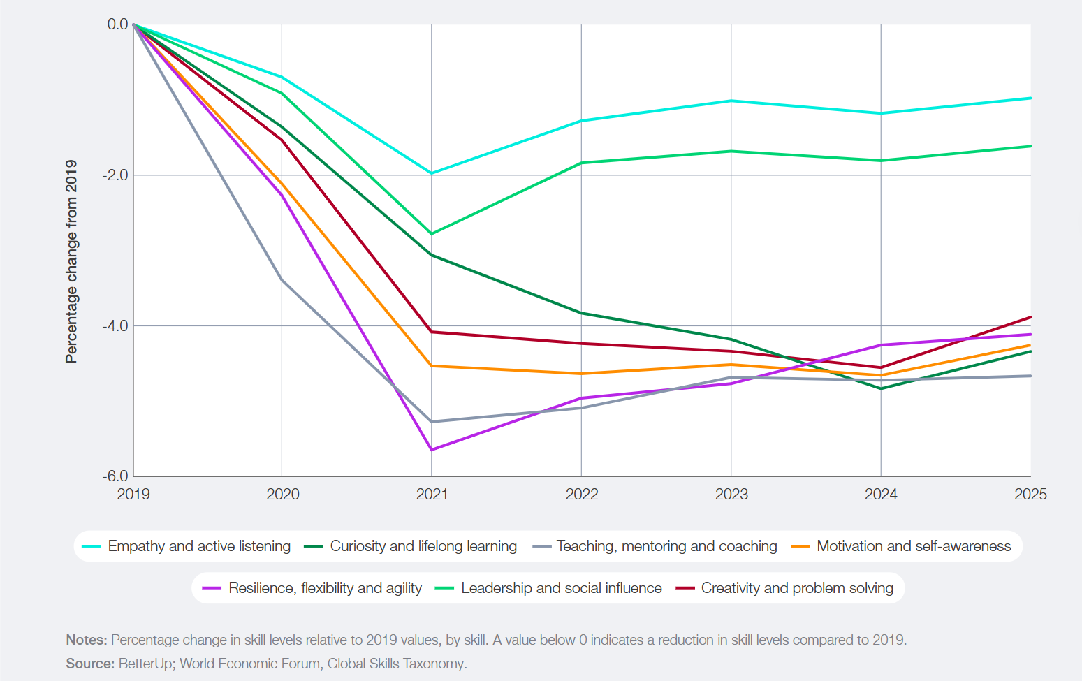 显示,疫情后所有人文技能都没回到2019年水平,其中教学、韧性下降超5%,就算到2025年也没缓过来。而且培养周期不短,50%的人要花141-245天才能掌握一项技能,比如共情力要141天,好奇心更是要245天。