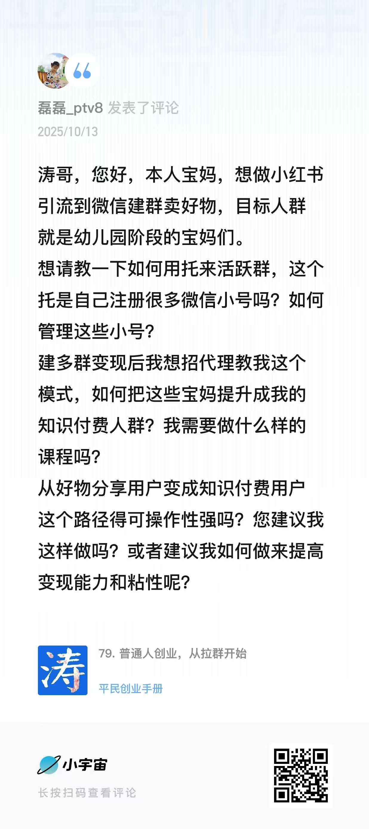 - 00:23 Q1:宝妈引流建群卖货,如何用托活跃群?如何招代理升级知识付费?