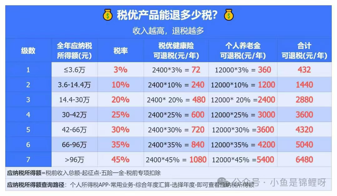 - 个人养老金与税优健康险的退税额度可以叠加。以税率20%为例,每年合计可退税 2880元;税率45%的高收入者,合计可省 6480。