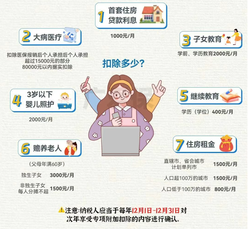 - 它是个税APP里的七大项(子女教育、赡养老人、住房租金/贷款利息、继续教育、大病医疗、3岁以下婴幼儿照护)。
