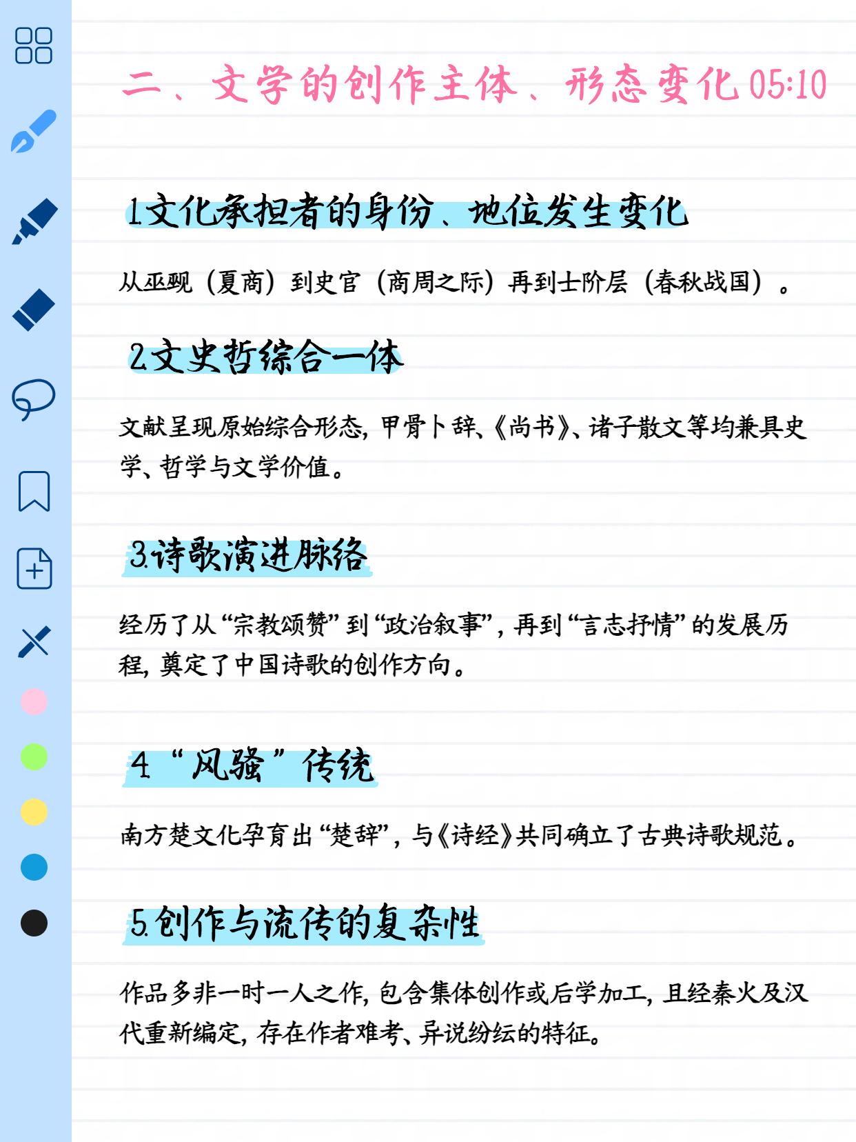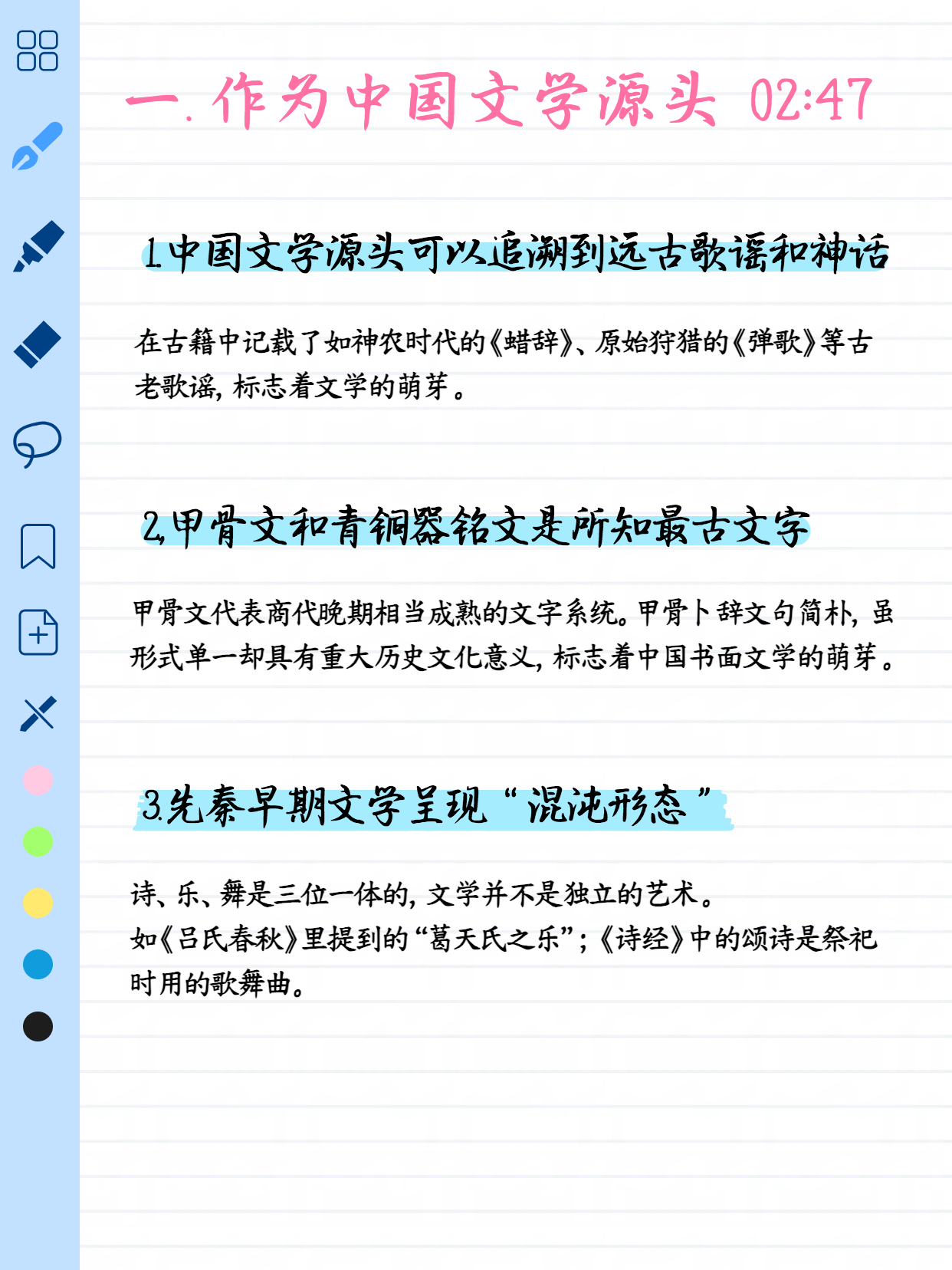 今天我们要聊的,是中国文学最波澜壮阔、也最具奠基意义的时代——先秦文学。对应的是袁行霈的中国文学史第一卷,先秦文学——绪论部分。先秦时期被称为中国文学的上古期第一段。我们今天能读到的诗词歌赋、能感悟到的美学意境,其根源几乎都可以追溯到此。先秦是中国文学的童年。在那段时光里,文字还带着土地的潮湿和祭坛的烟火气,中国文学的浪漫和风骨,都能在那时找到雏形。